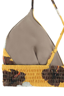 バストが内側に寄るように計算されたパターンで、一般的なトライアングルビキニよりも優れたバストアップ効果が期待できる一着です。