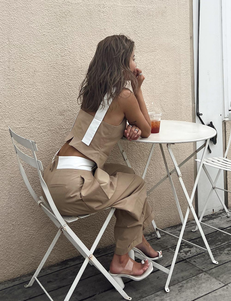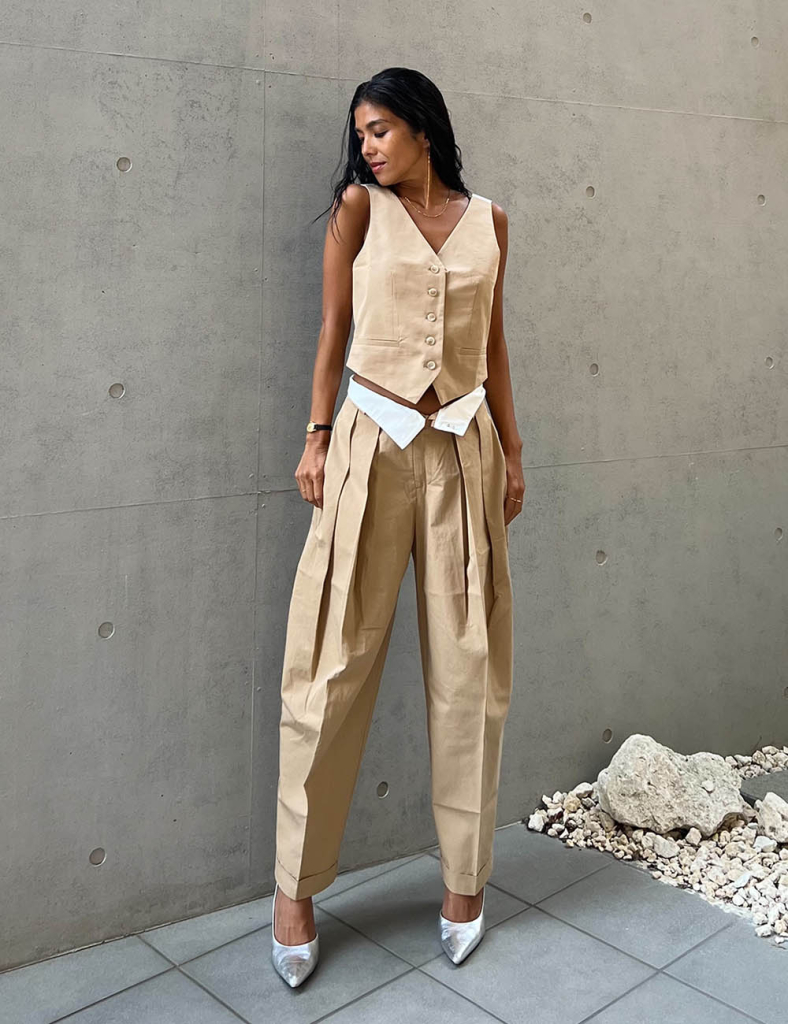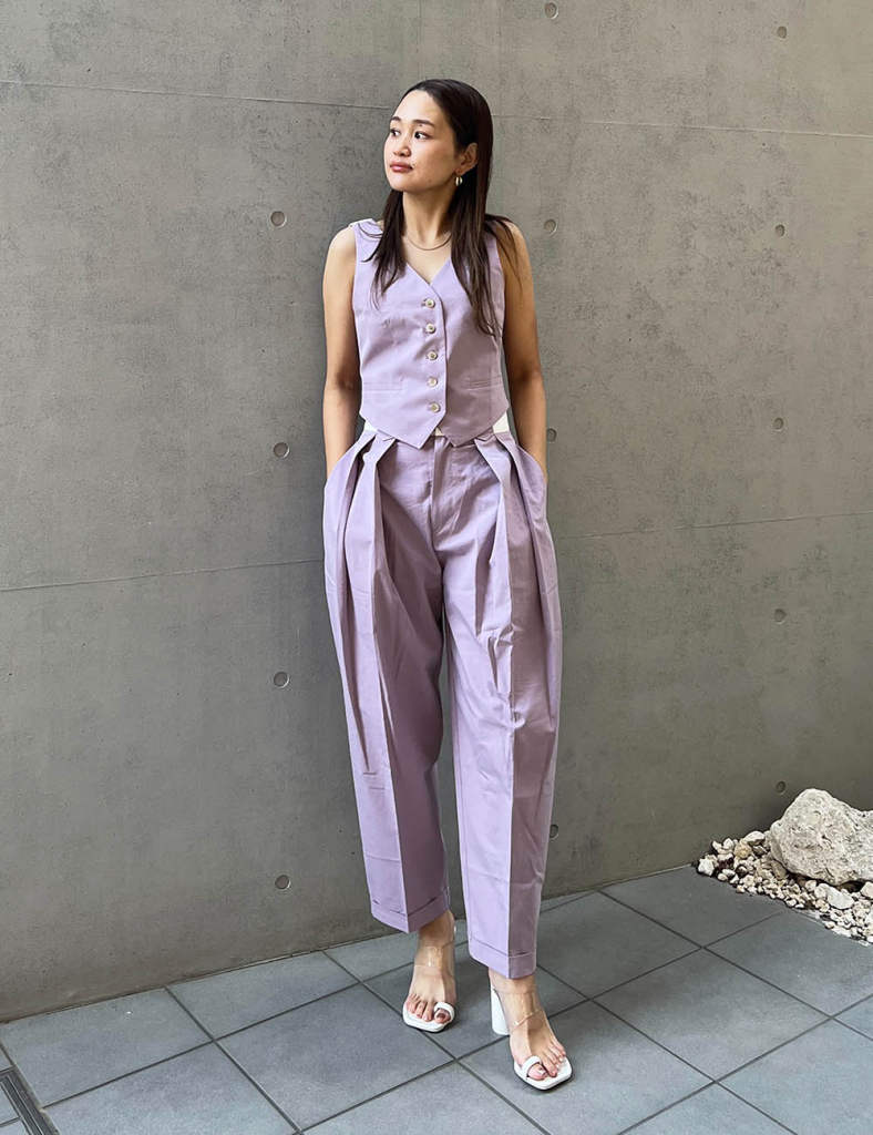 前後ろで表情が異なる、クールな印象のタイトベスト。