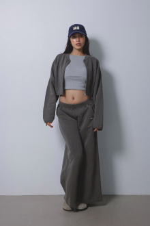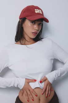 フロントに施された立体ロゴ刺しゅうがスタイリング全体のアクセントとなり、カジュアルからフェミニンまで幅広くマッチ。