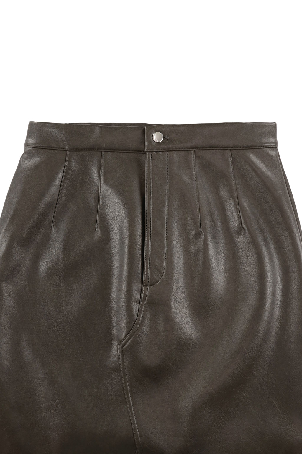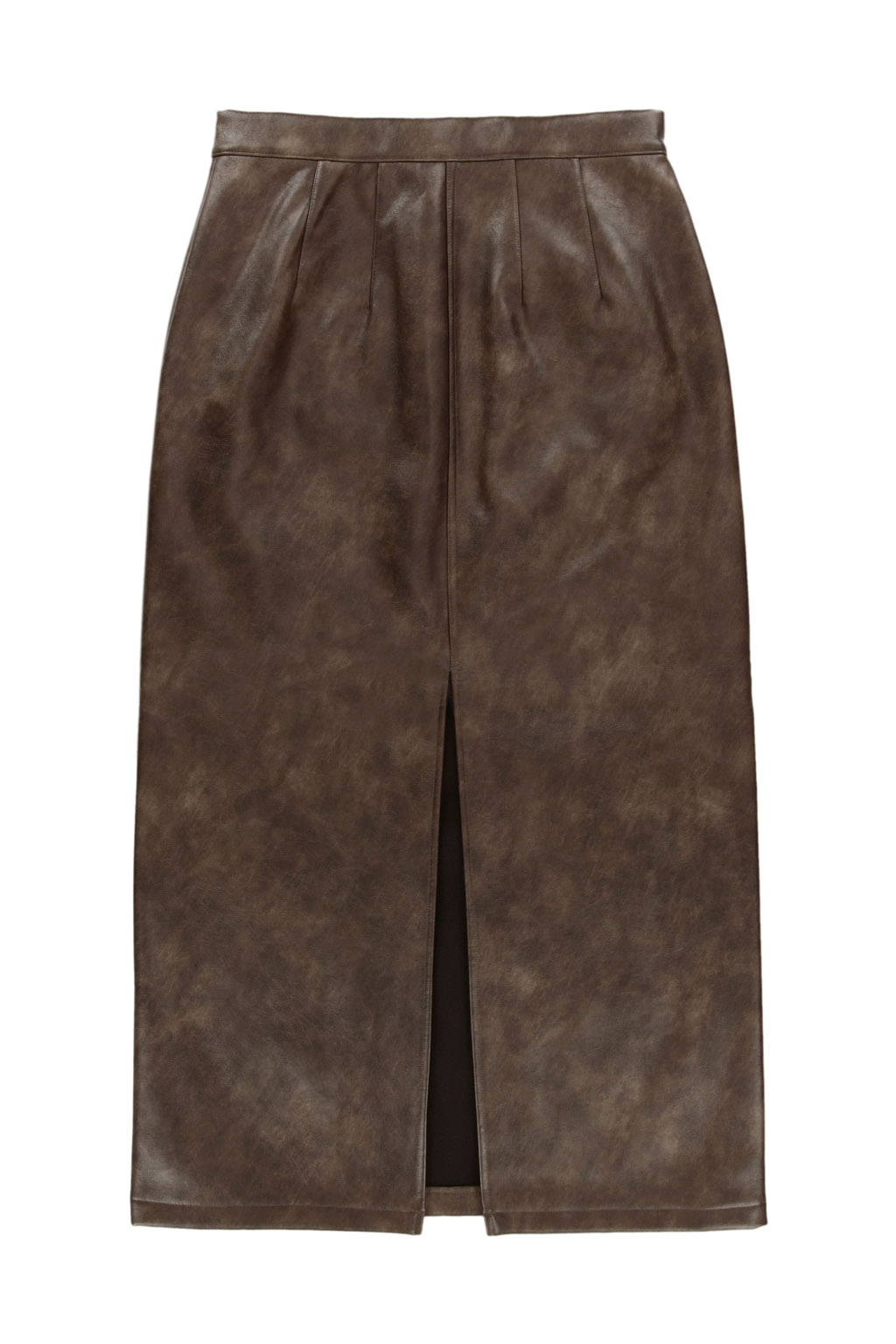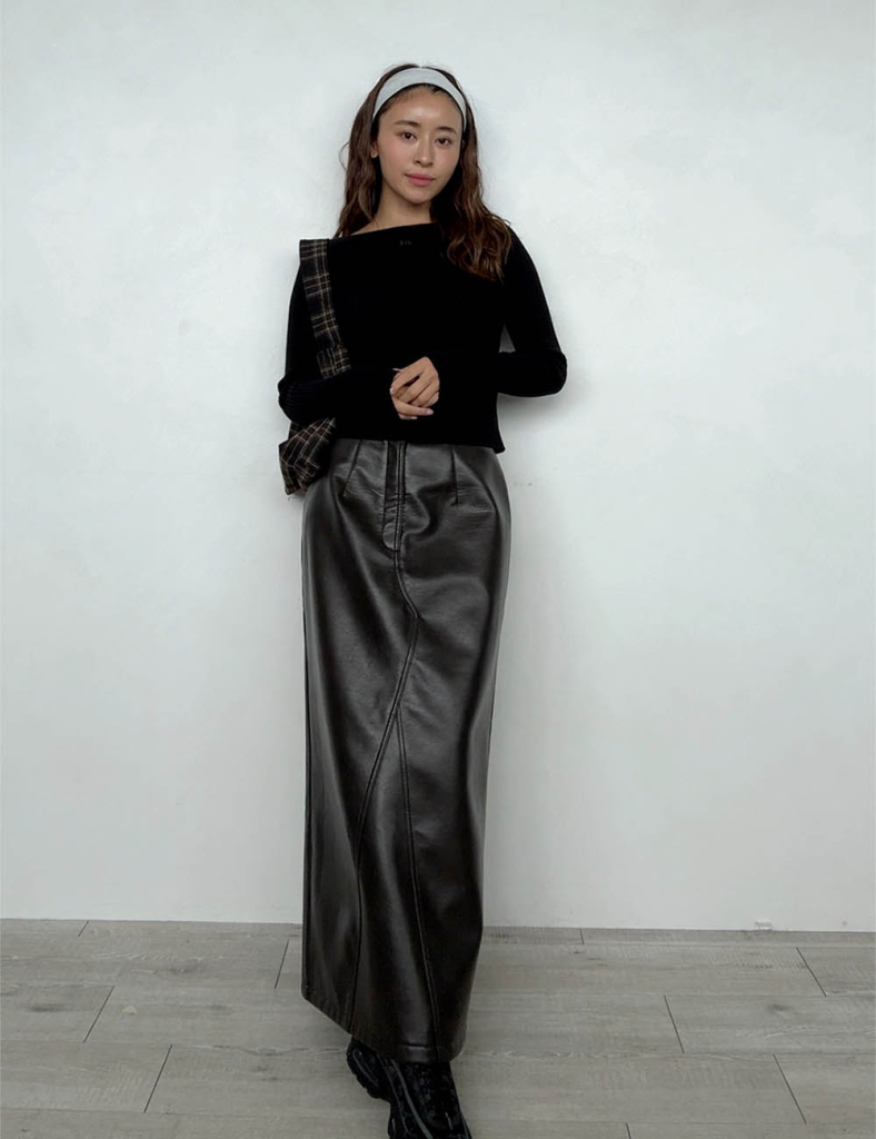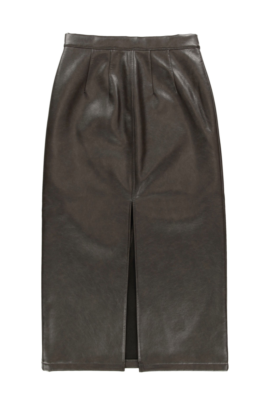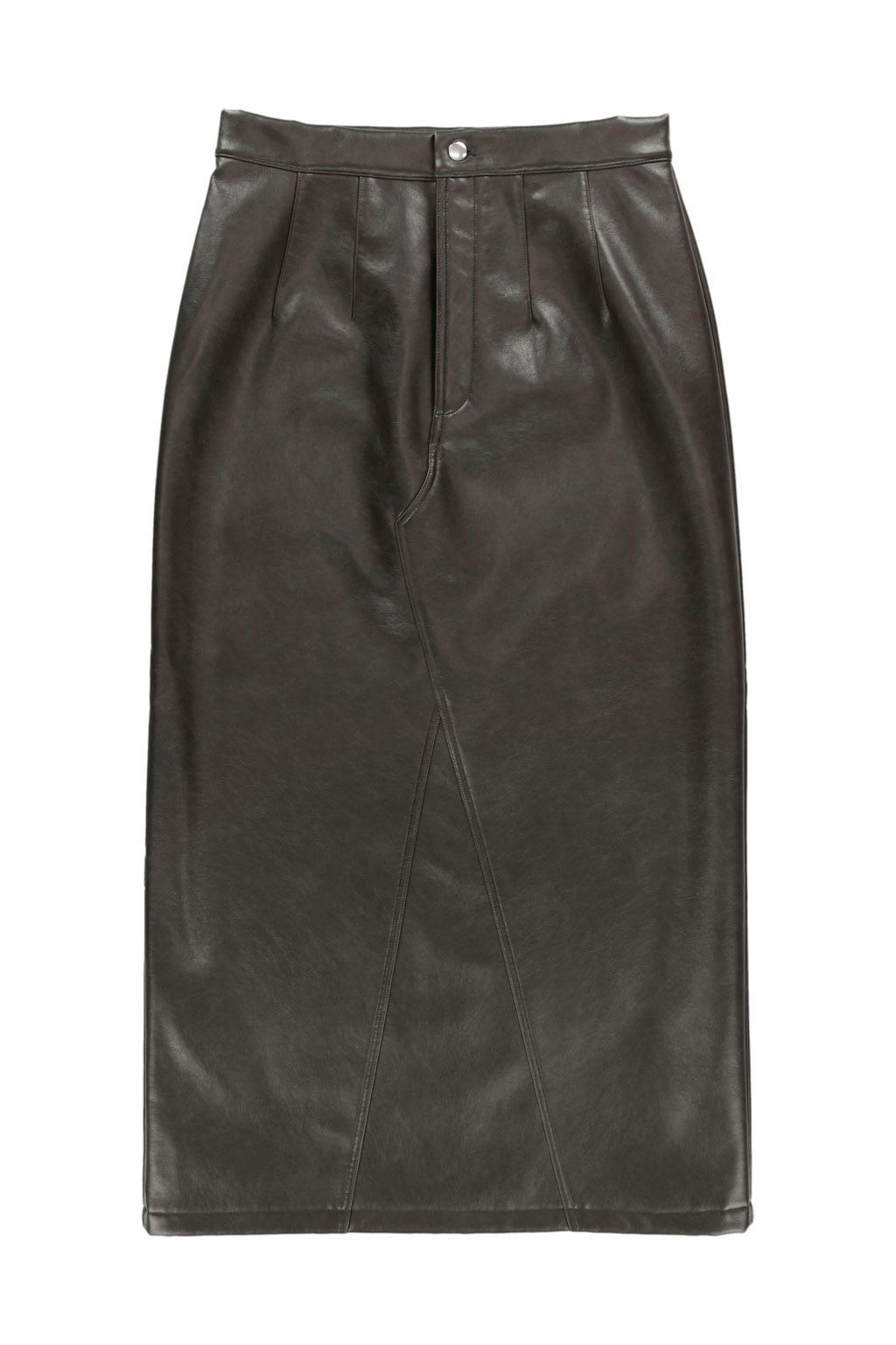 上品な艶をまとったフェイクレザー素材が魅力のスカート。
