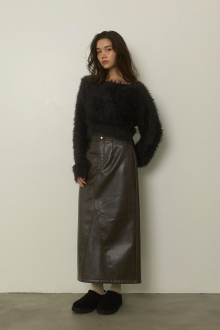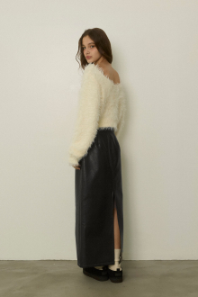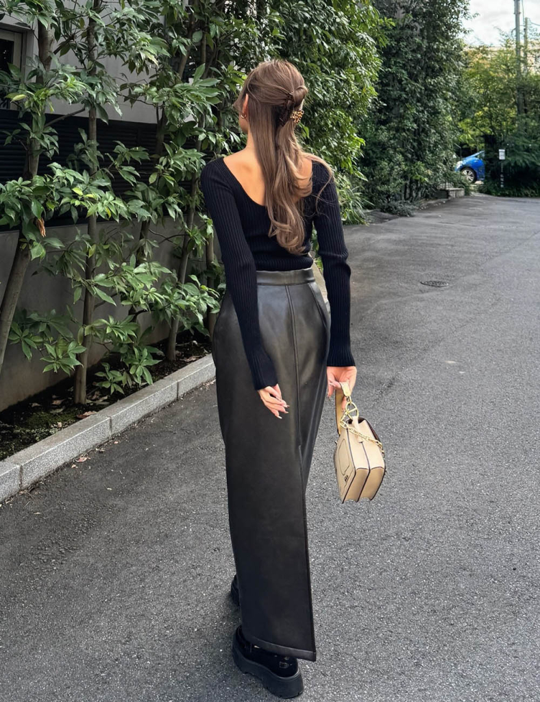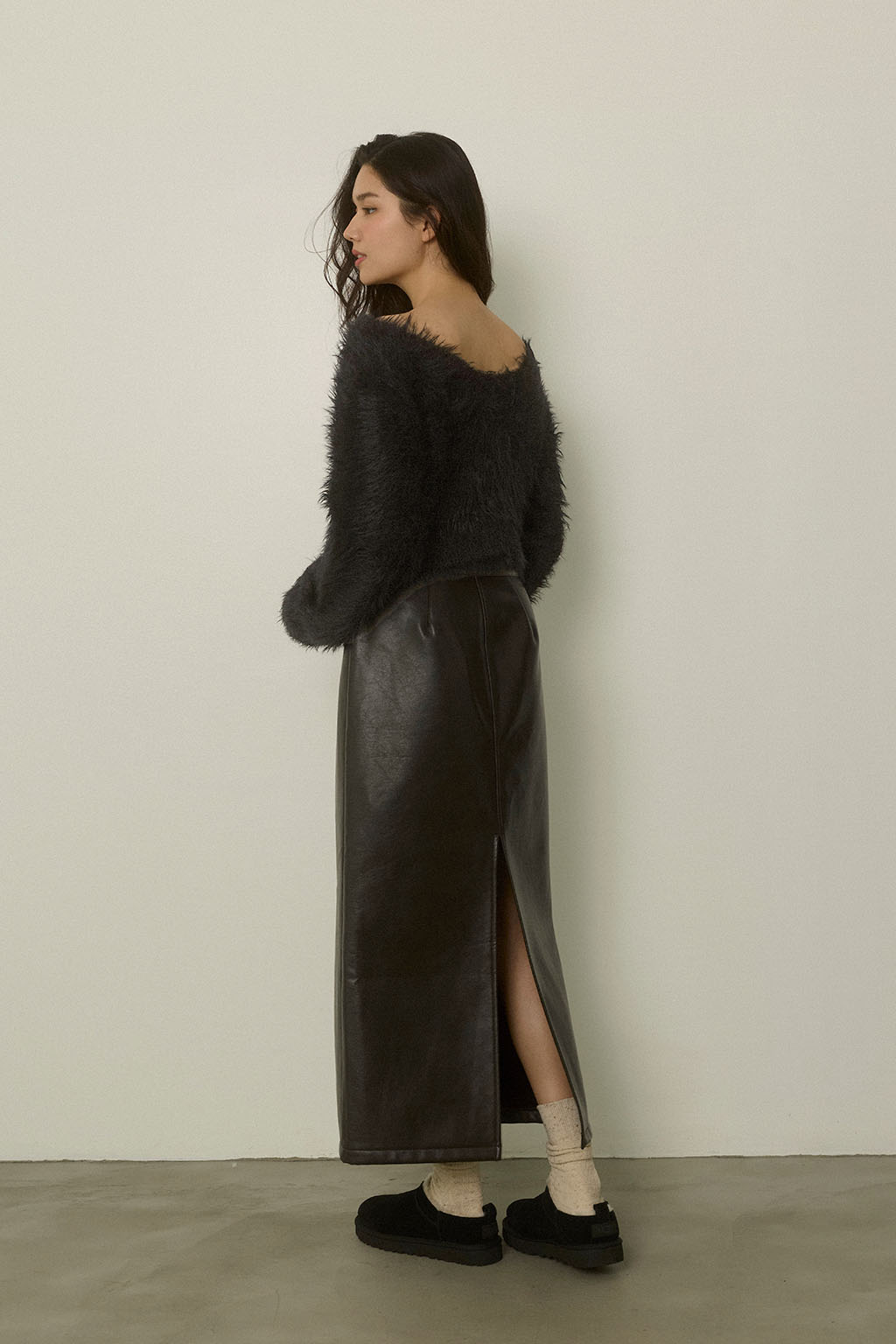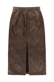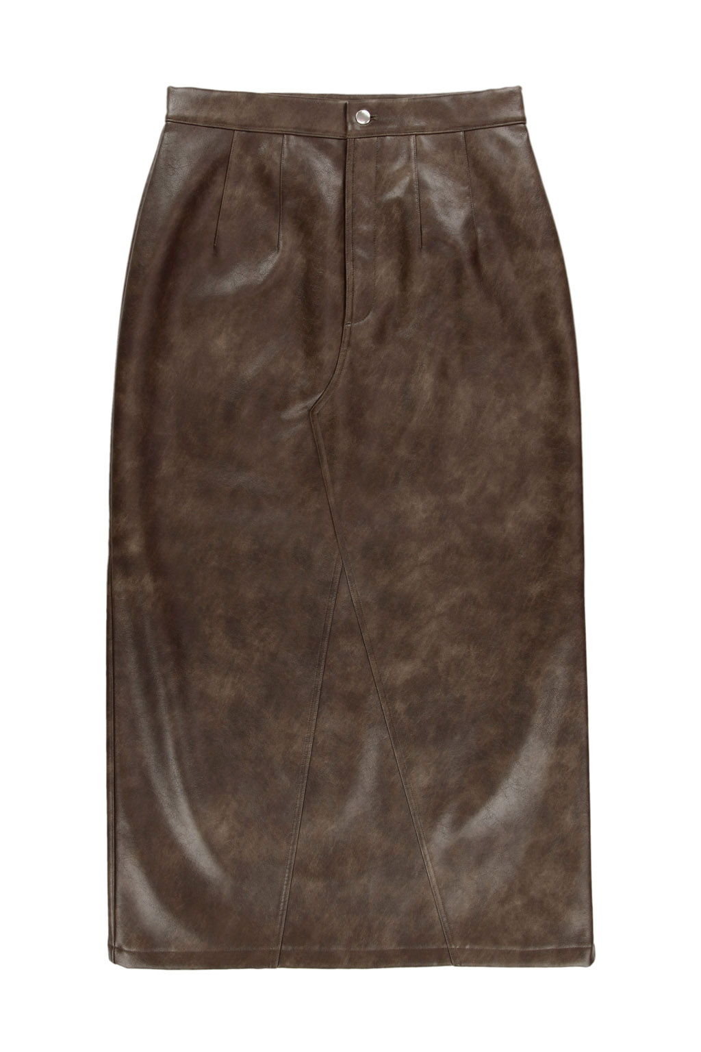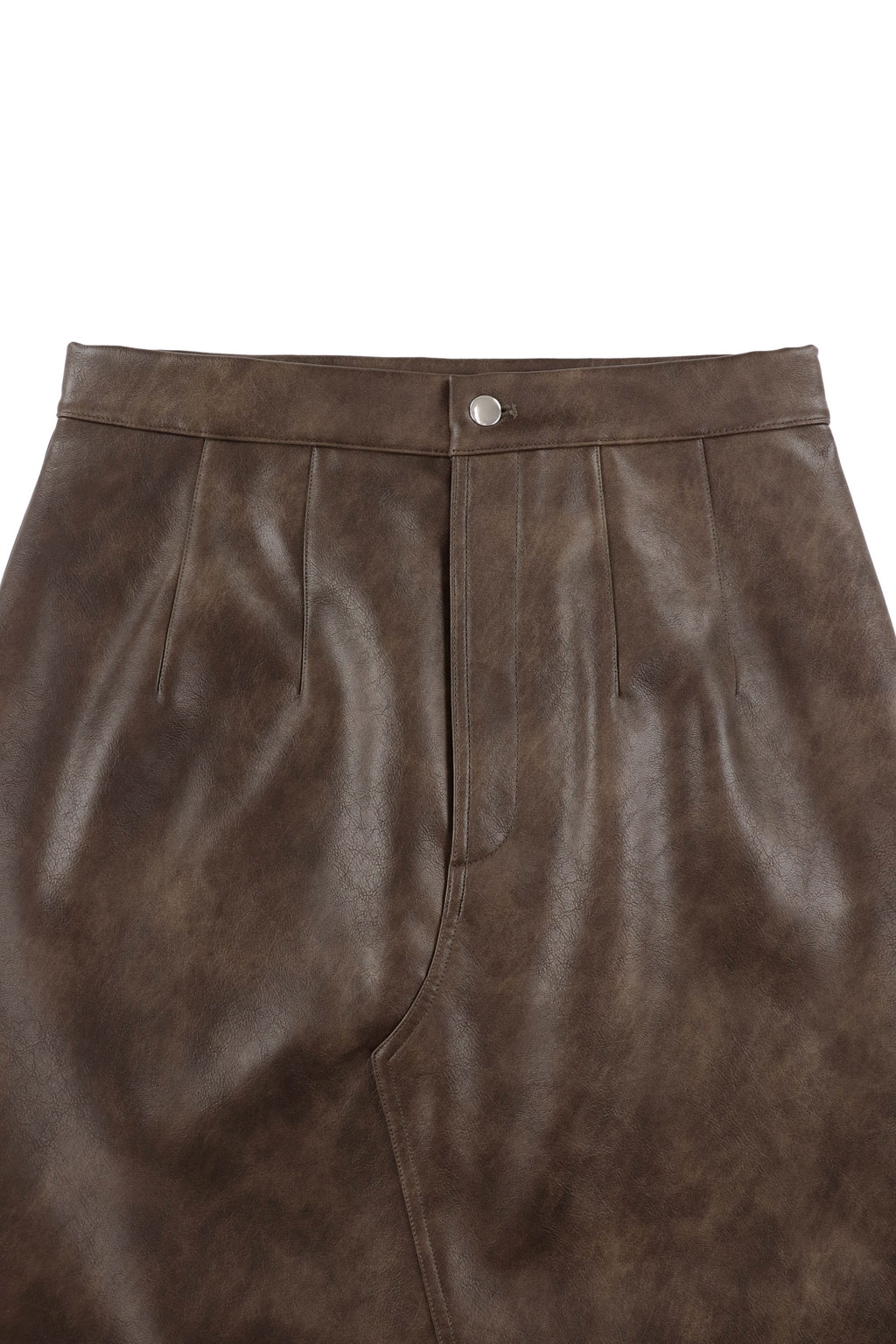 上品な艶をまとったフェイクレザー素材が魅力のスカート。