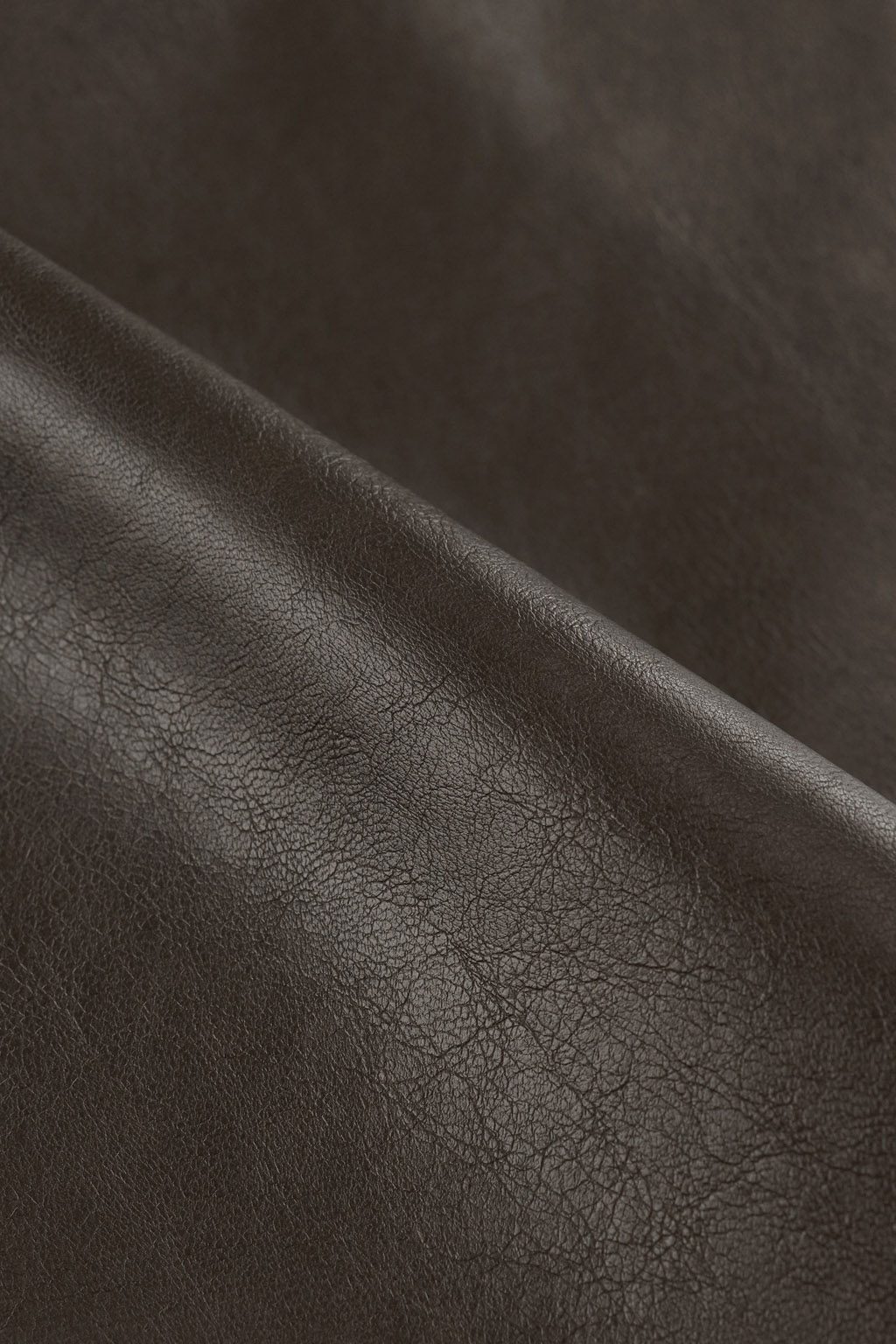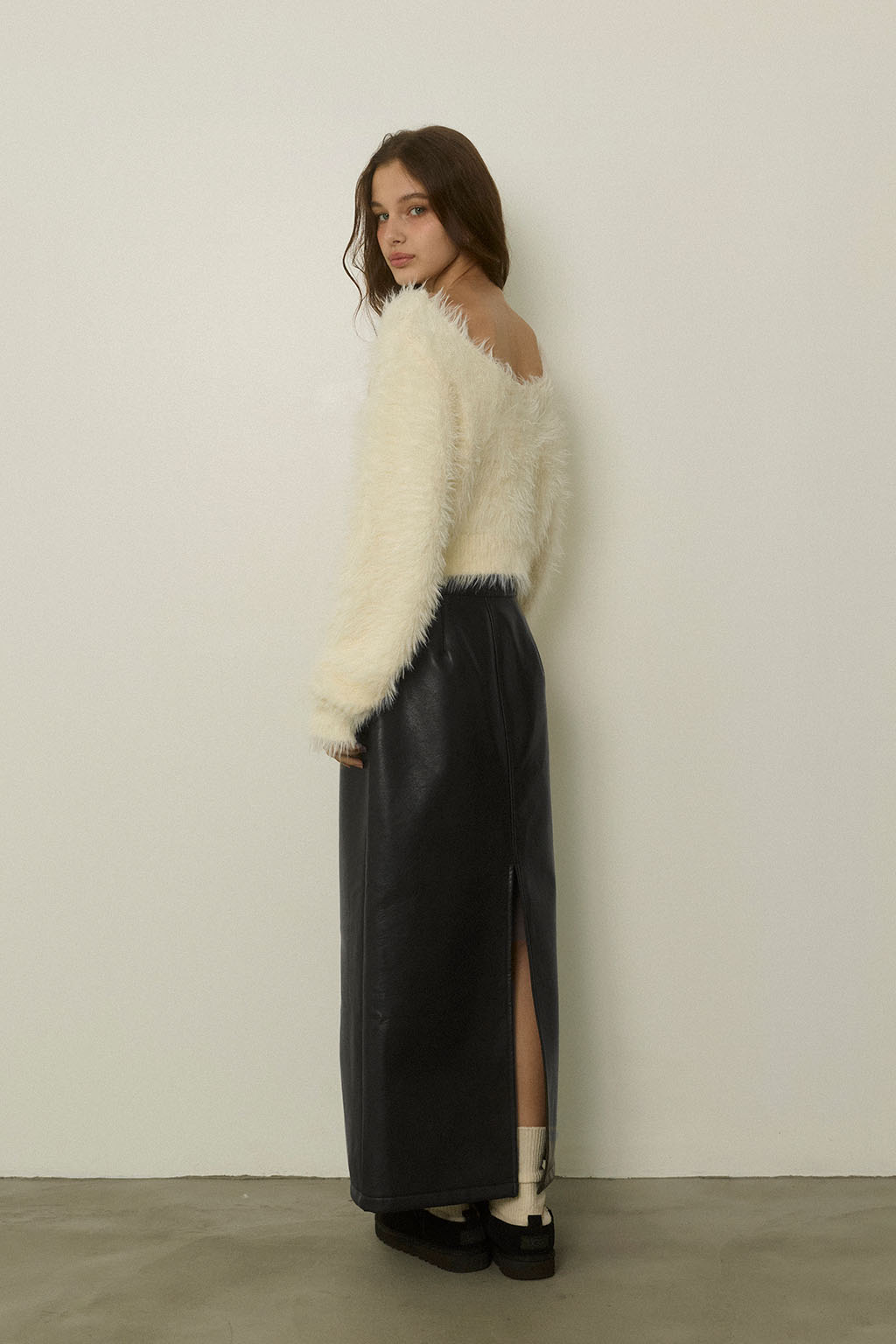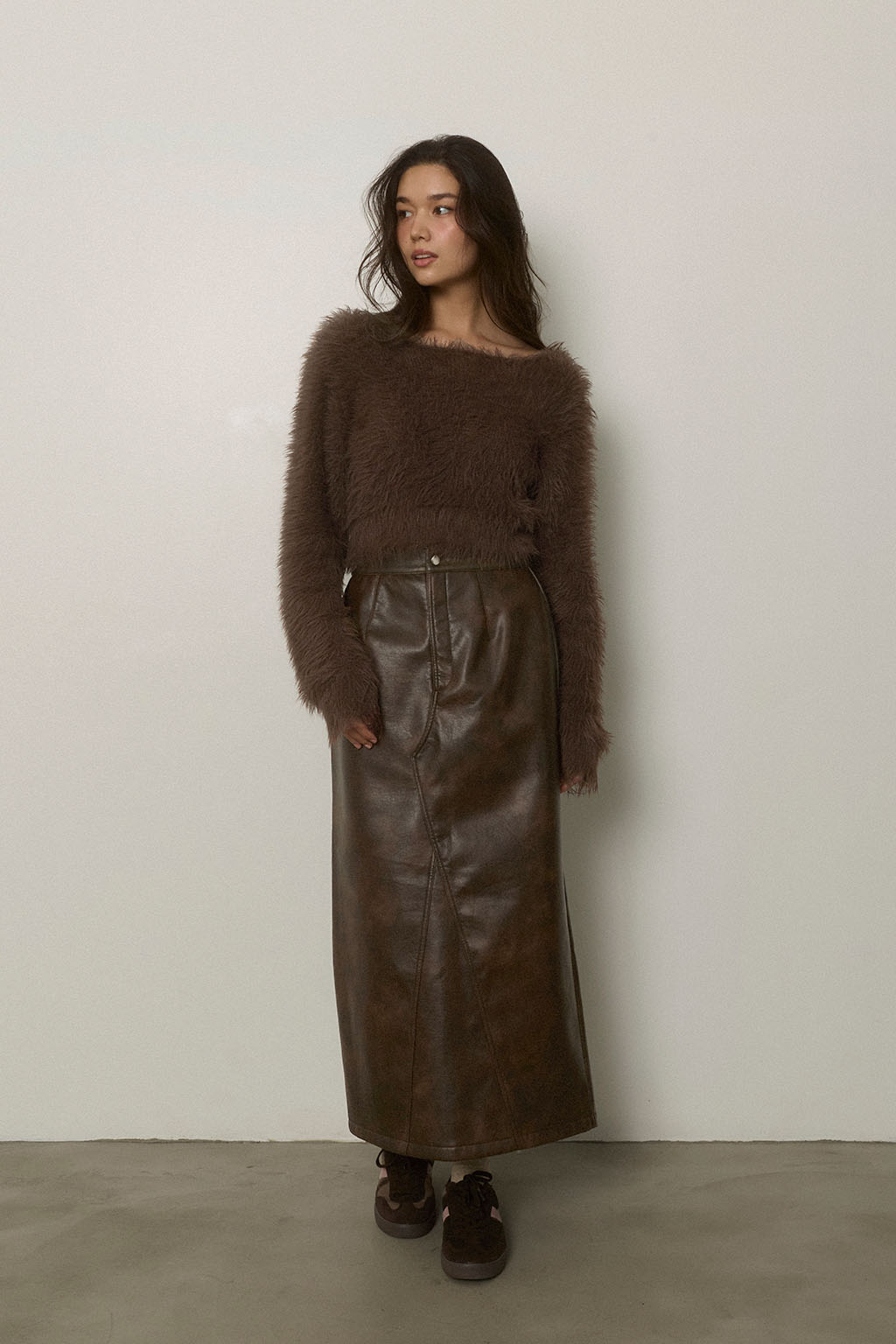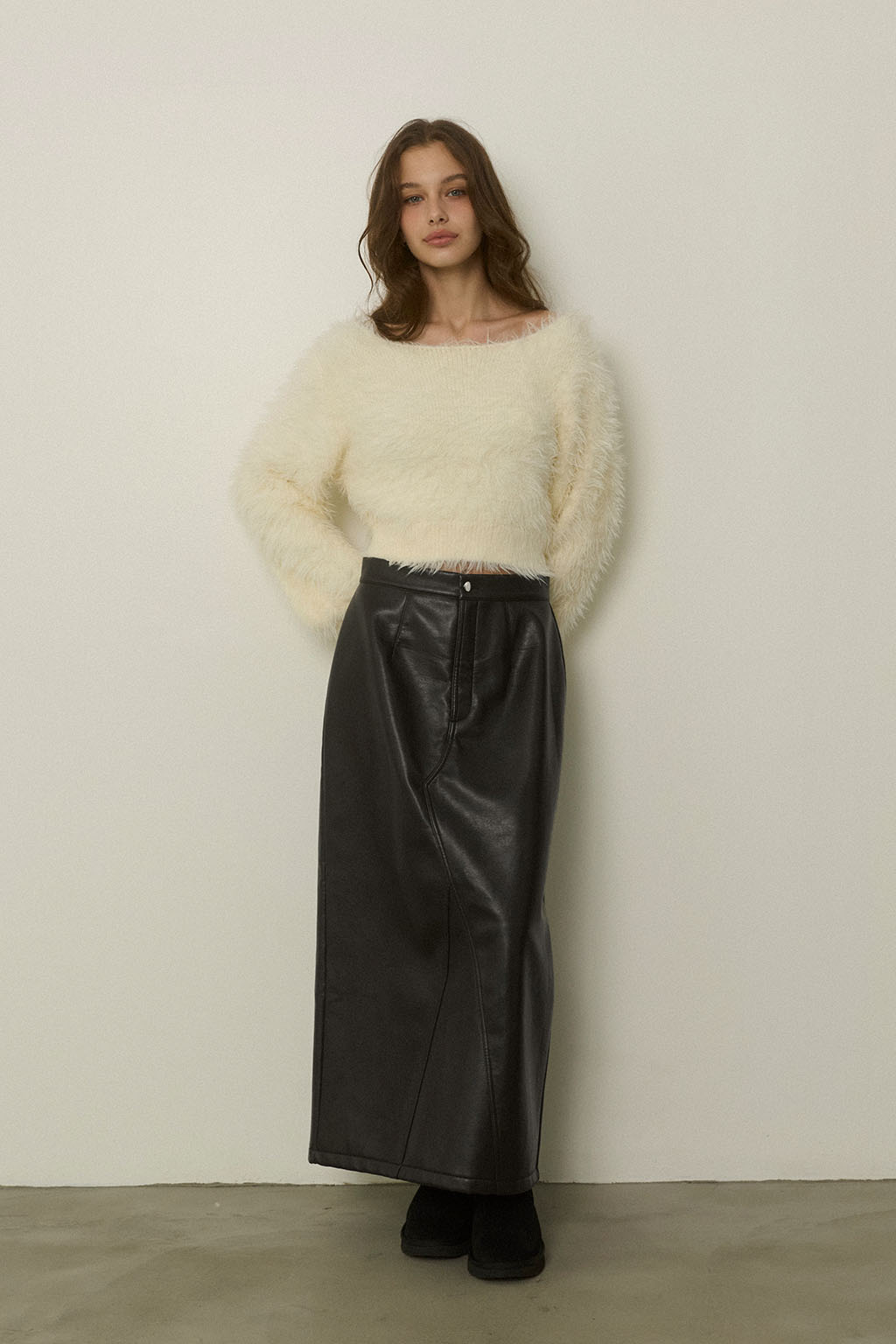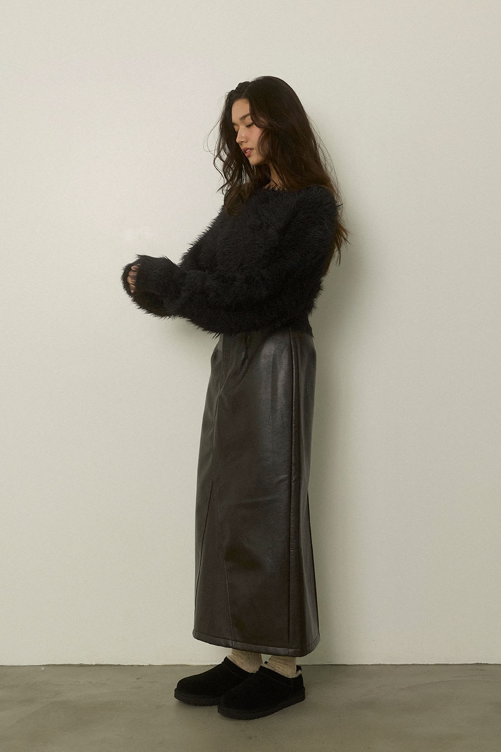 上品な艶をまとったフェイクレザー素材が魅力のスカート。