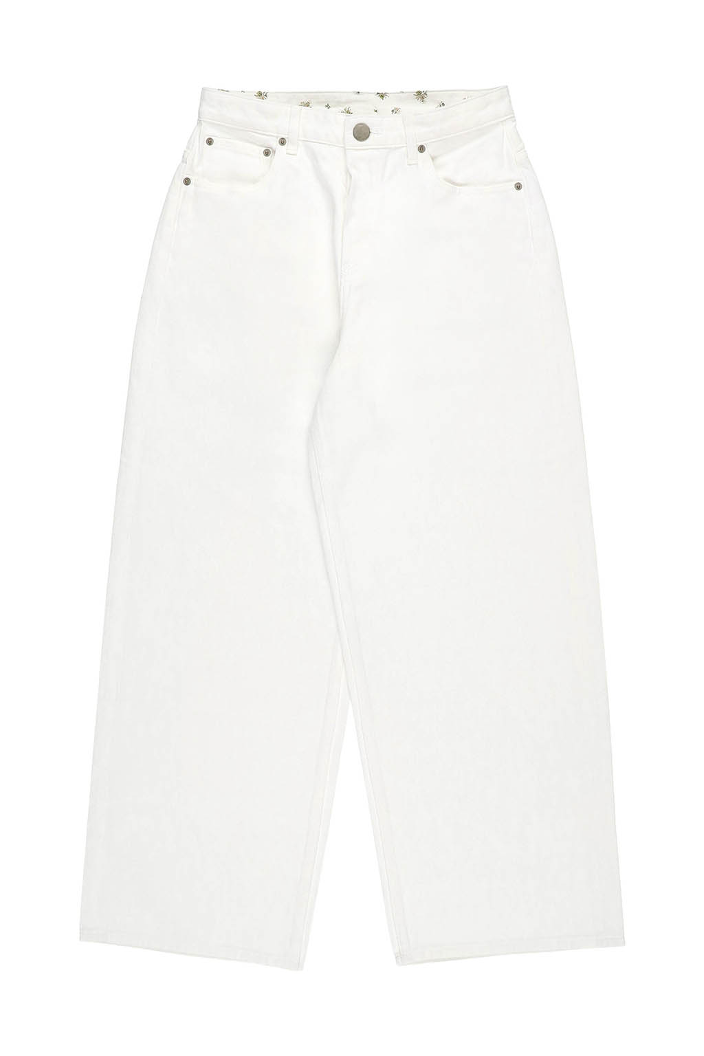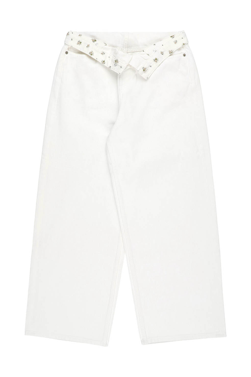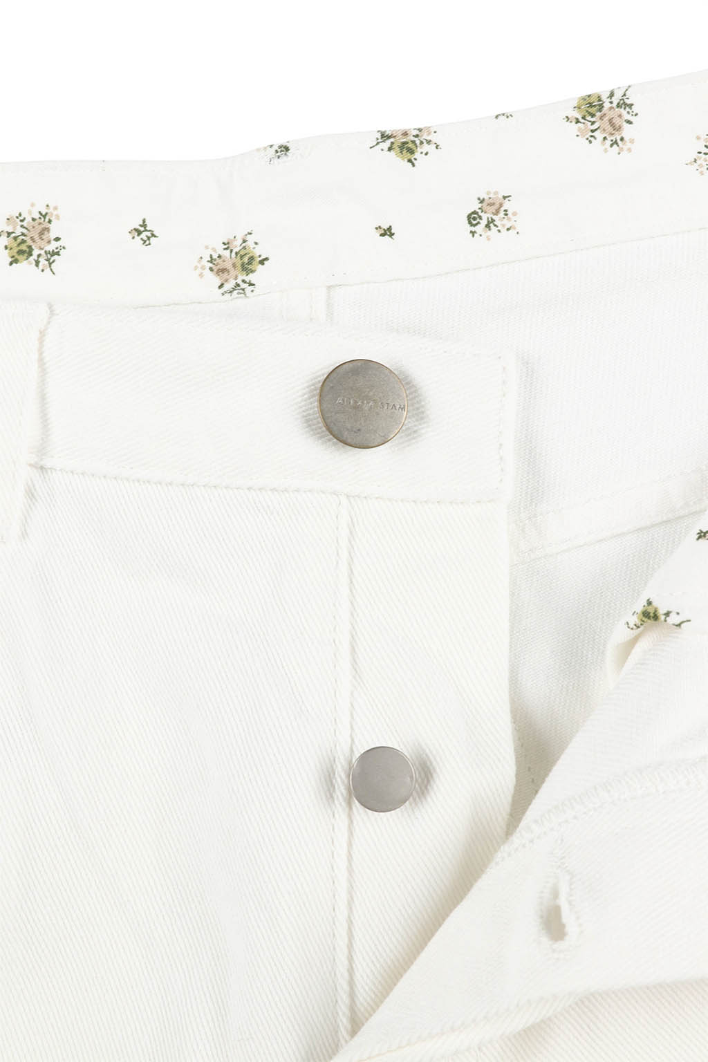 ウエスト内側にはさりげなく小花柄の生地をあしらい、折り返して柄を覗かせたスタイリングも楽しめるデザインに。