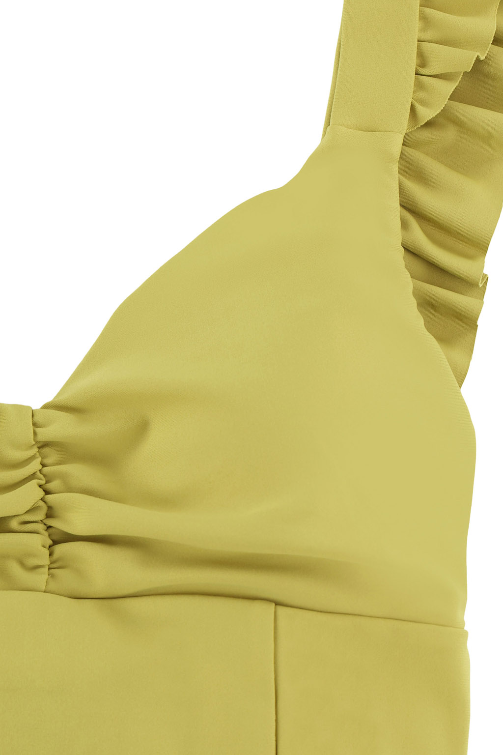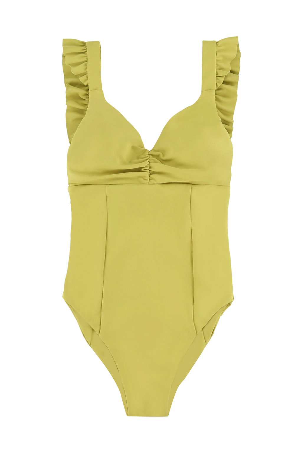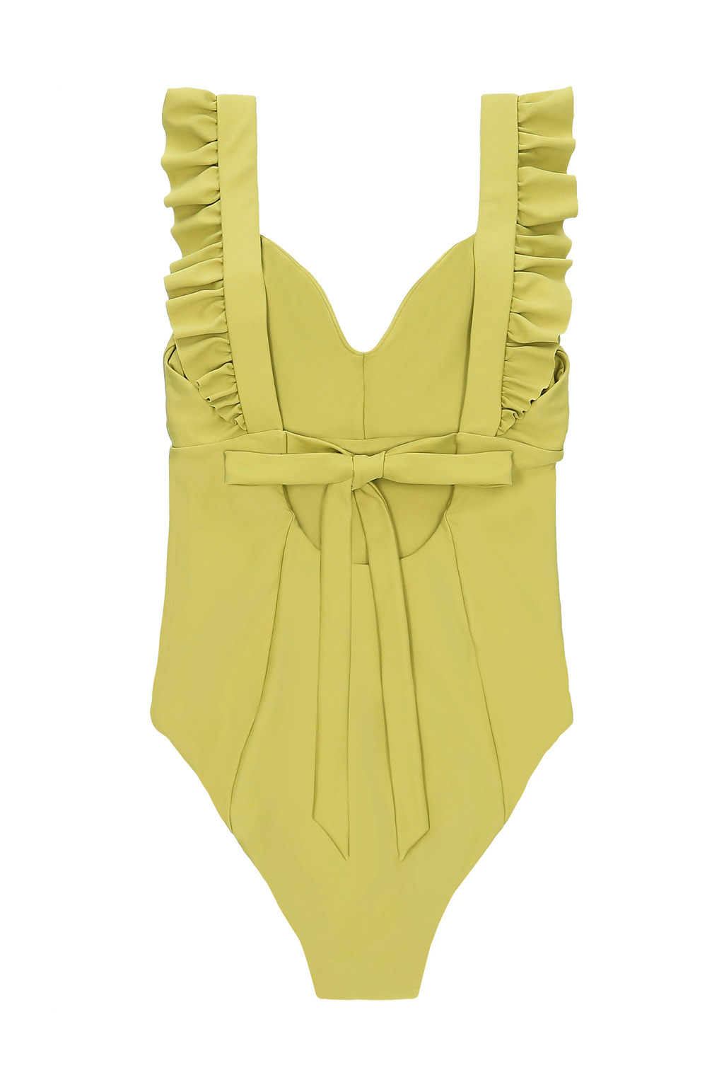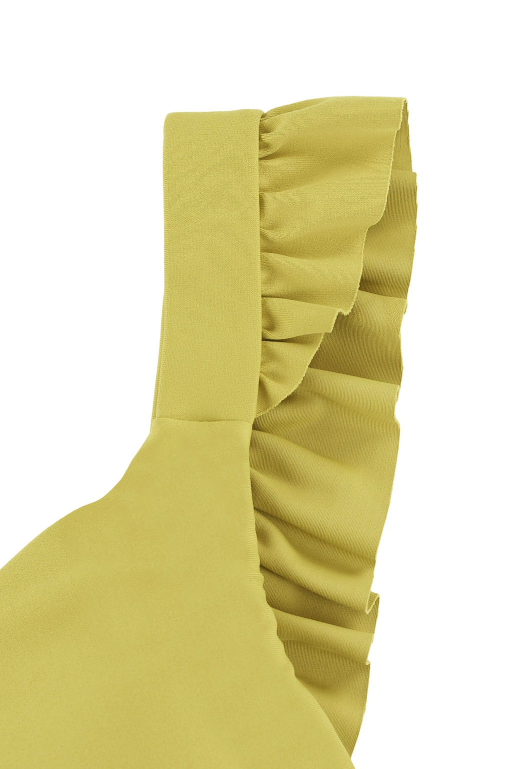肩から背中にかけてあしらわれたフリルと、大きく開いたバックスタイルが印象的な、ワンピースタイプの Hollie (ホリー)。