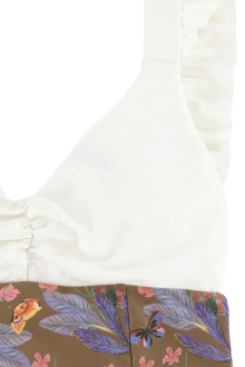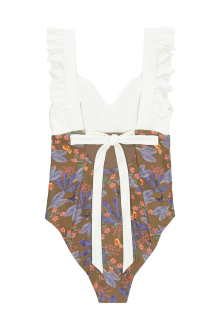 肩から背中にかけてあしらわれたフリルと、大きく開いたバックスタイルが印象的な、ワンピースタイプの Hollie (ホリー)。