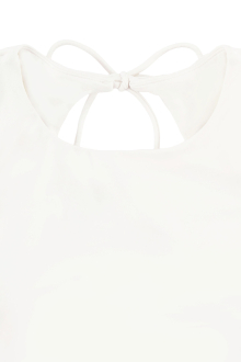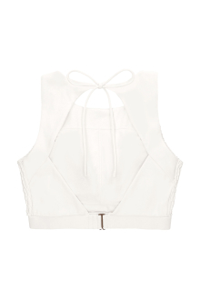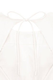 フロントは隠しながらもバックは大きく開き、調節可能なリボン紐がアクセントに。