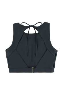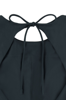 フロントは隠しながらもバックは大きく開き、調節可能なリボン紐がアクセントに。