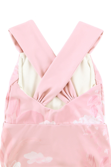 中心にギャザーが入った太めのストラップと、背中のクロスデザインが特徴的です。
