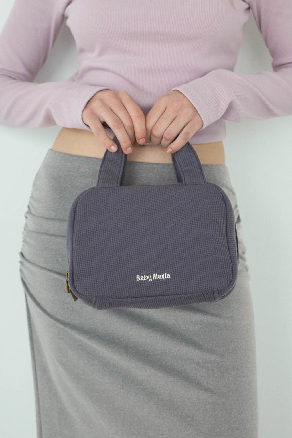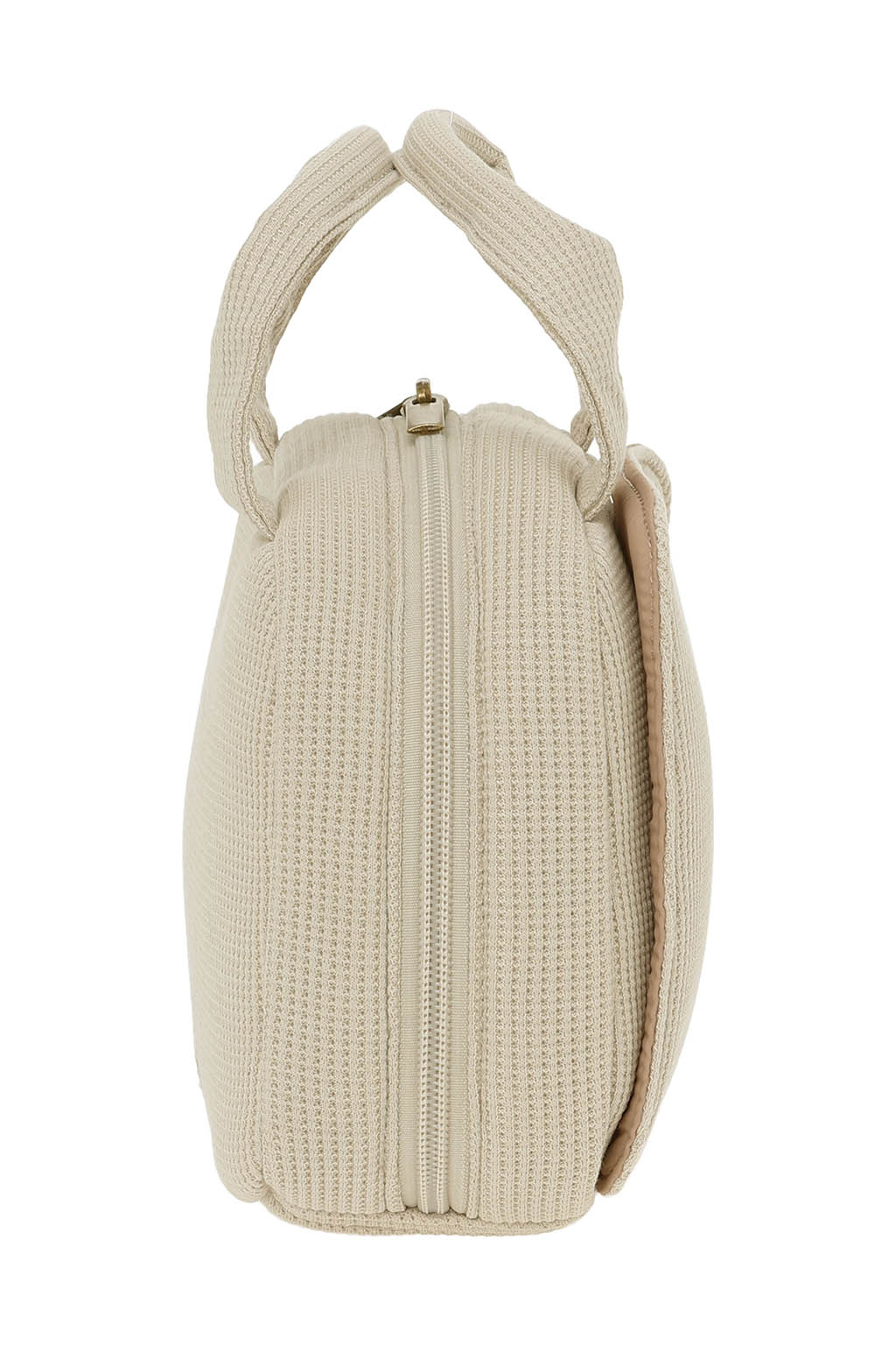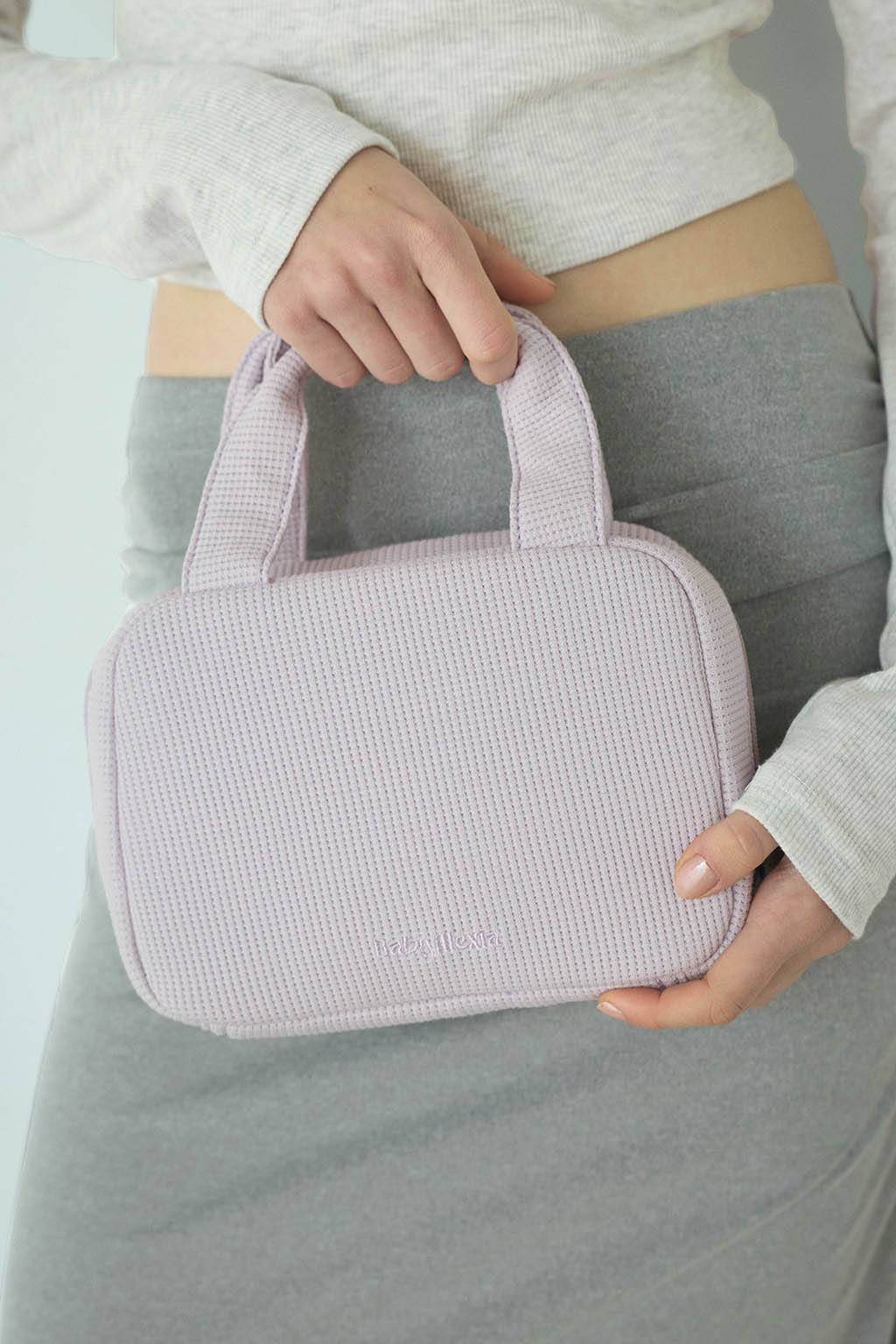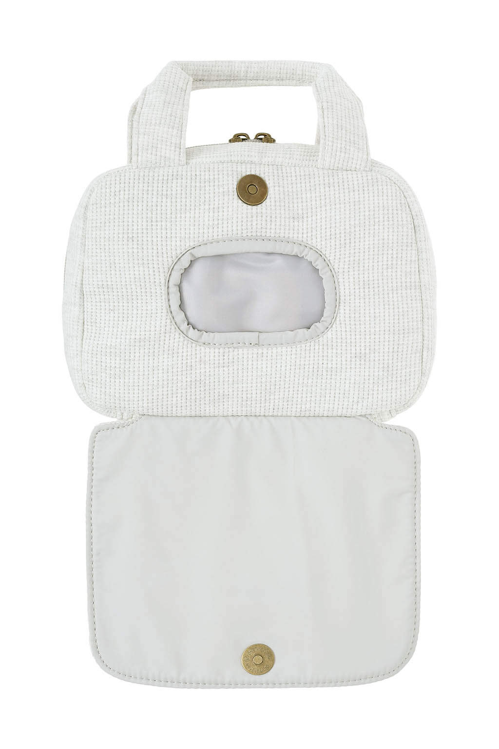 やさしい風合いのワッフル素材を使用した、丸みのあるフォルムのおむつポーチ。