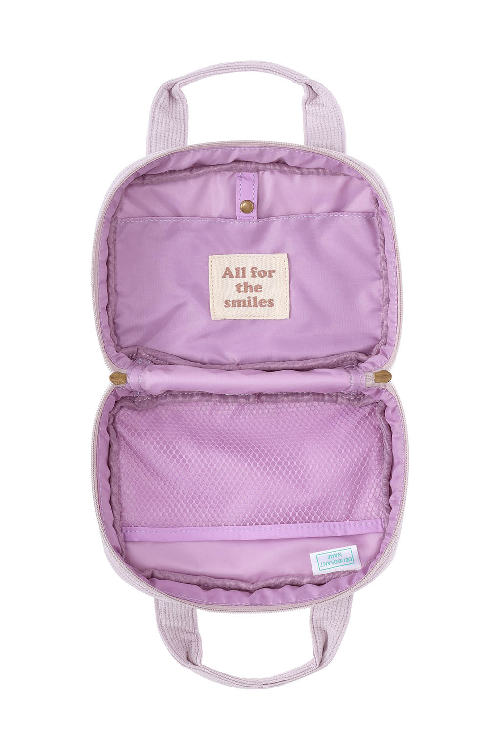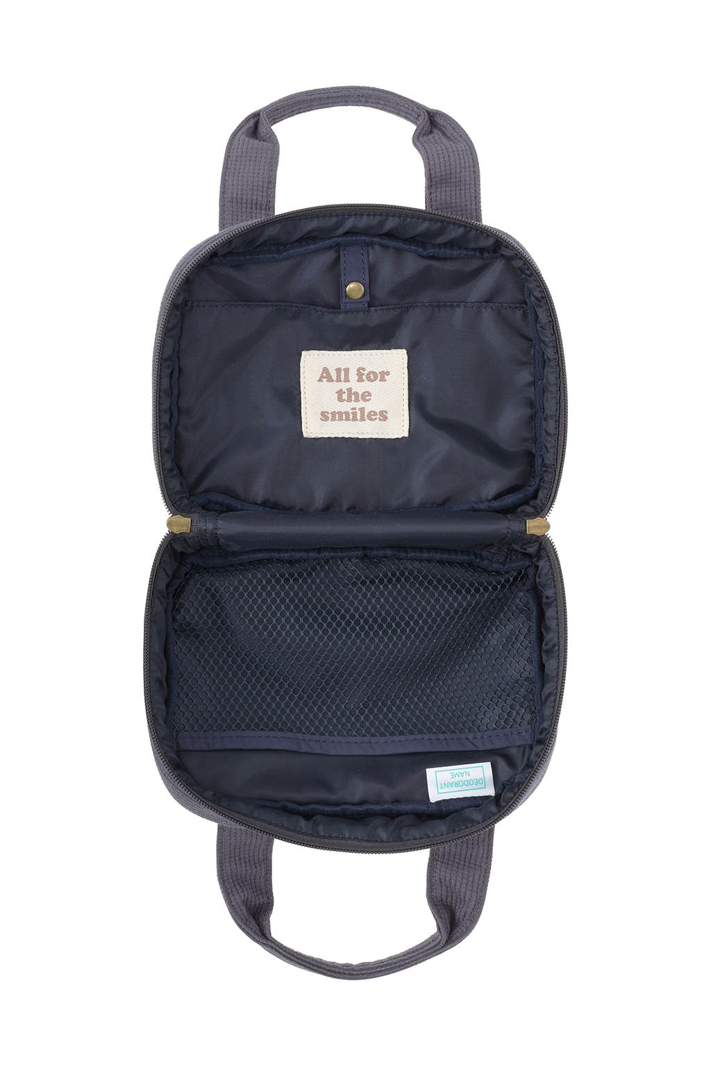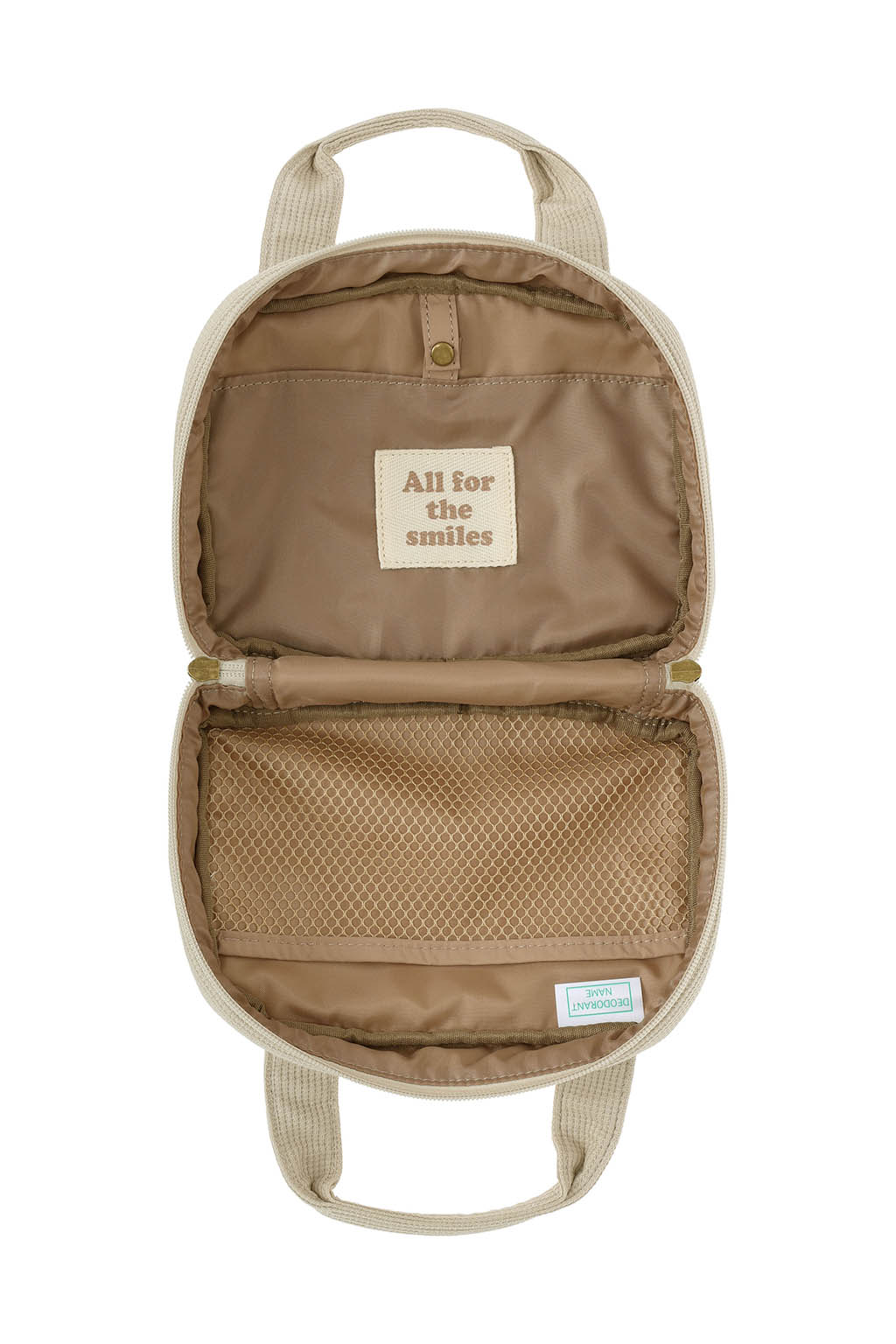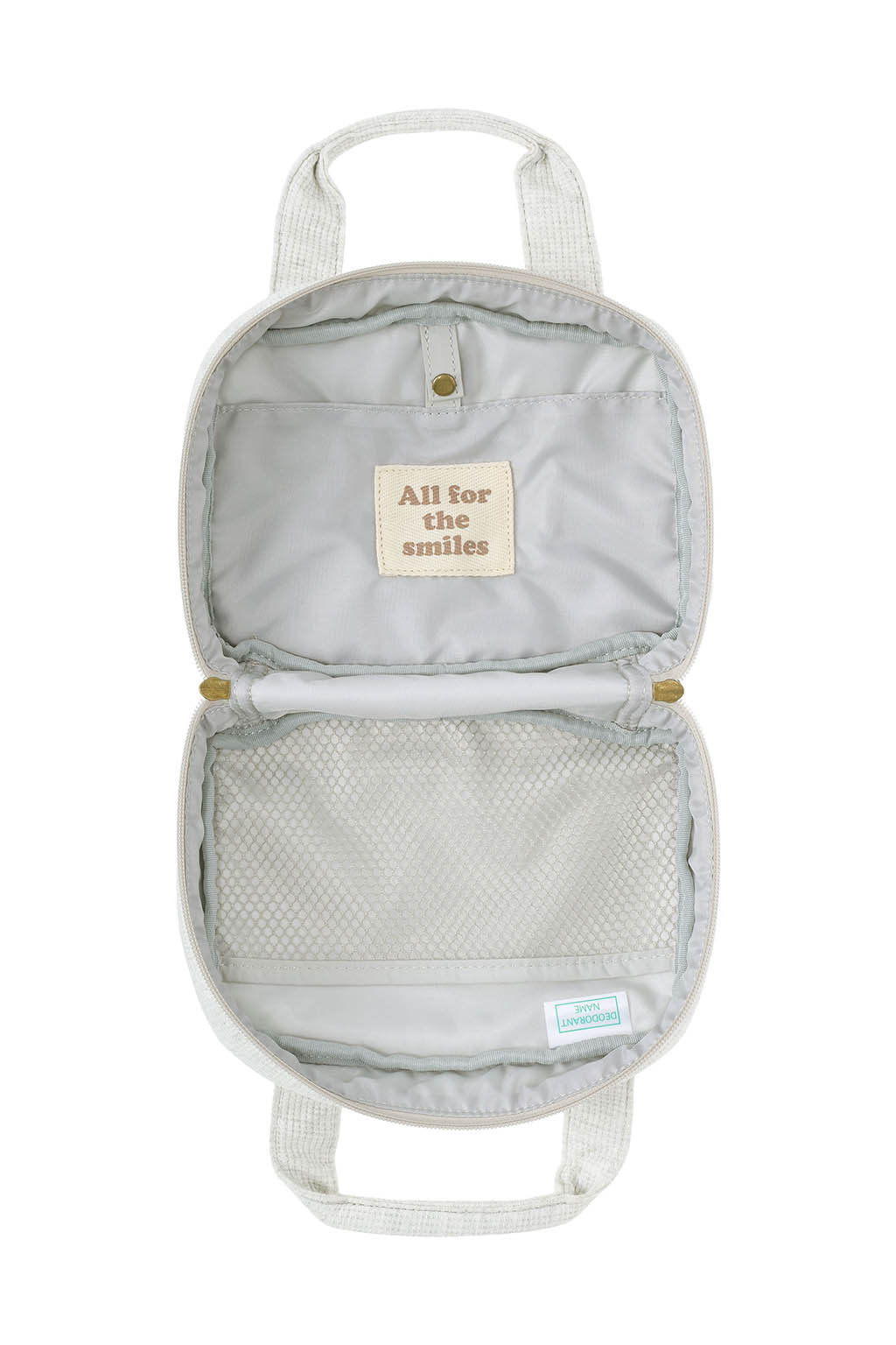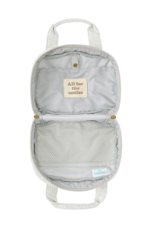 内側にはメッシュポケットを備え、おむつやおしりふき、小物類をすっきりと仕分け収納可能。