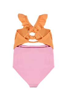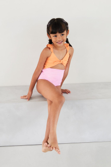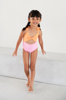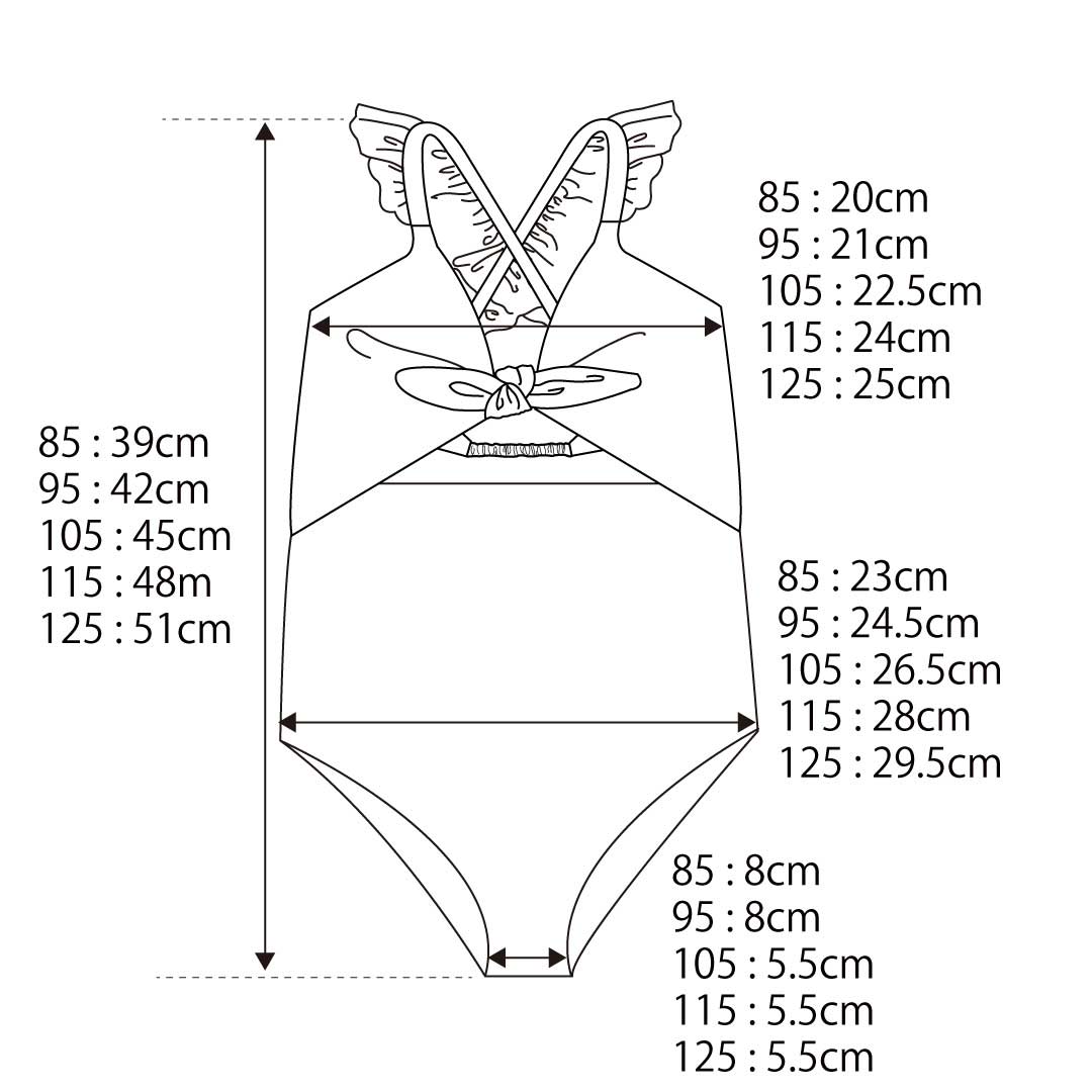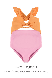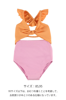 肩紐のフリルと少しだけ見えるお腹が、小さなビーチガールをもっと可愛く見せるスペシャルビキニです。