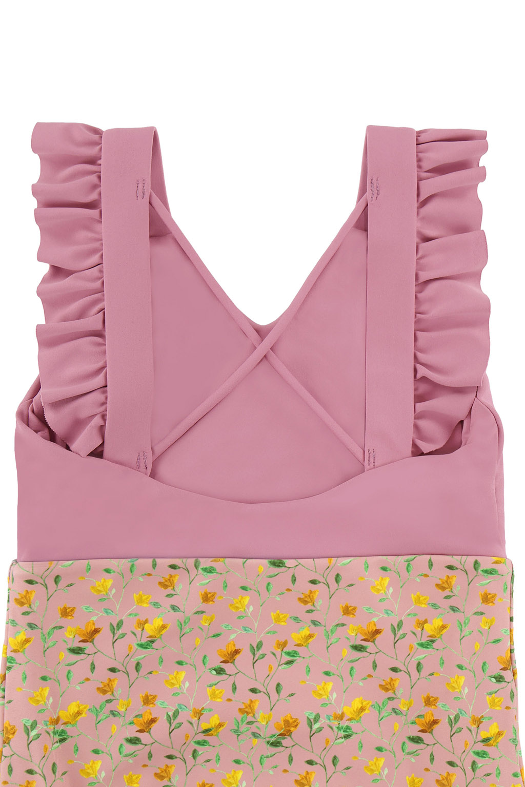 肩から背中にかけてあしらわれたフリルと、大きく開いた背中が特徴的です。