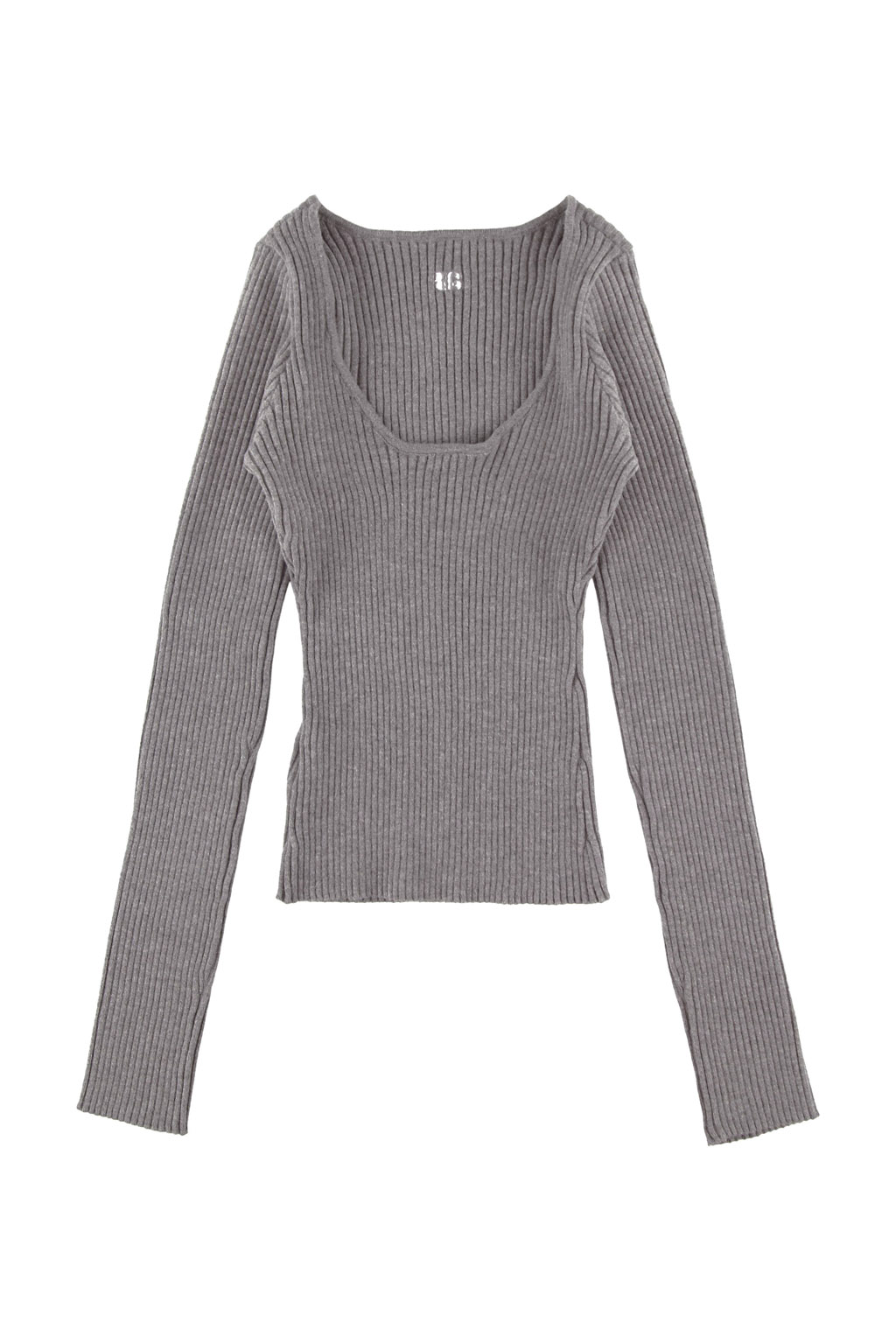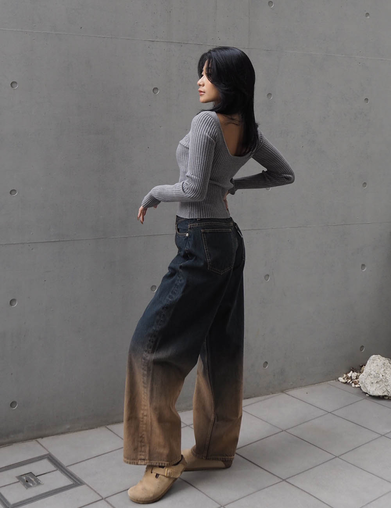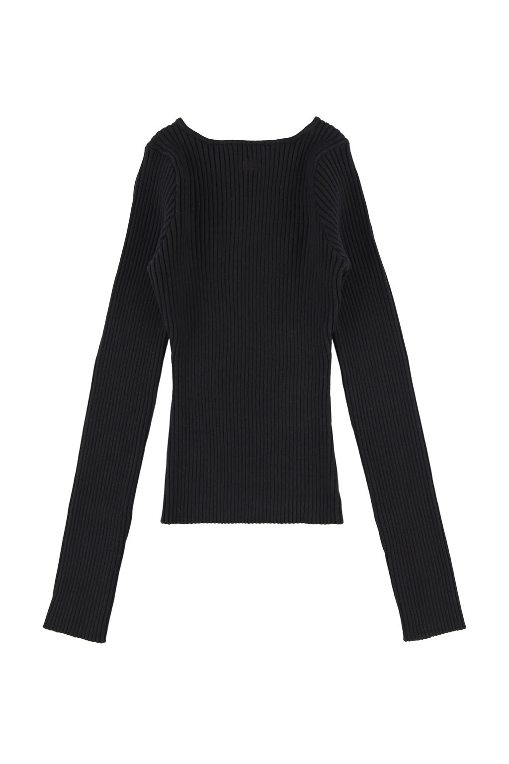 伸縮性のあるリブ編みが女性らしいシルエットを引き立てる、背中開きニットトップス。