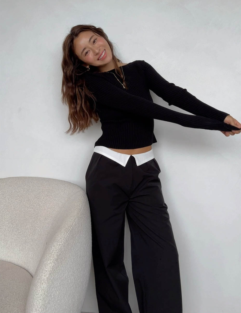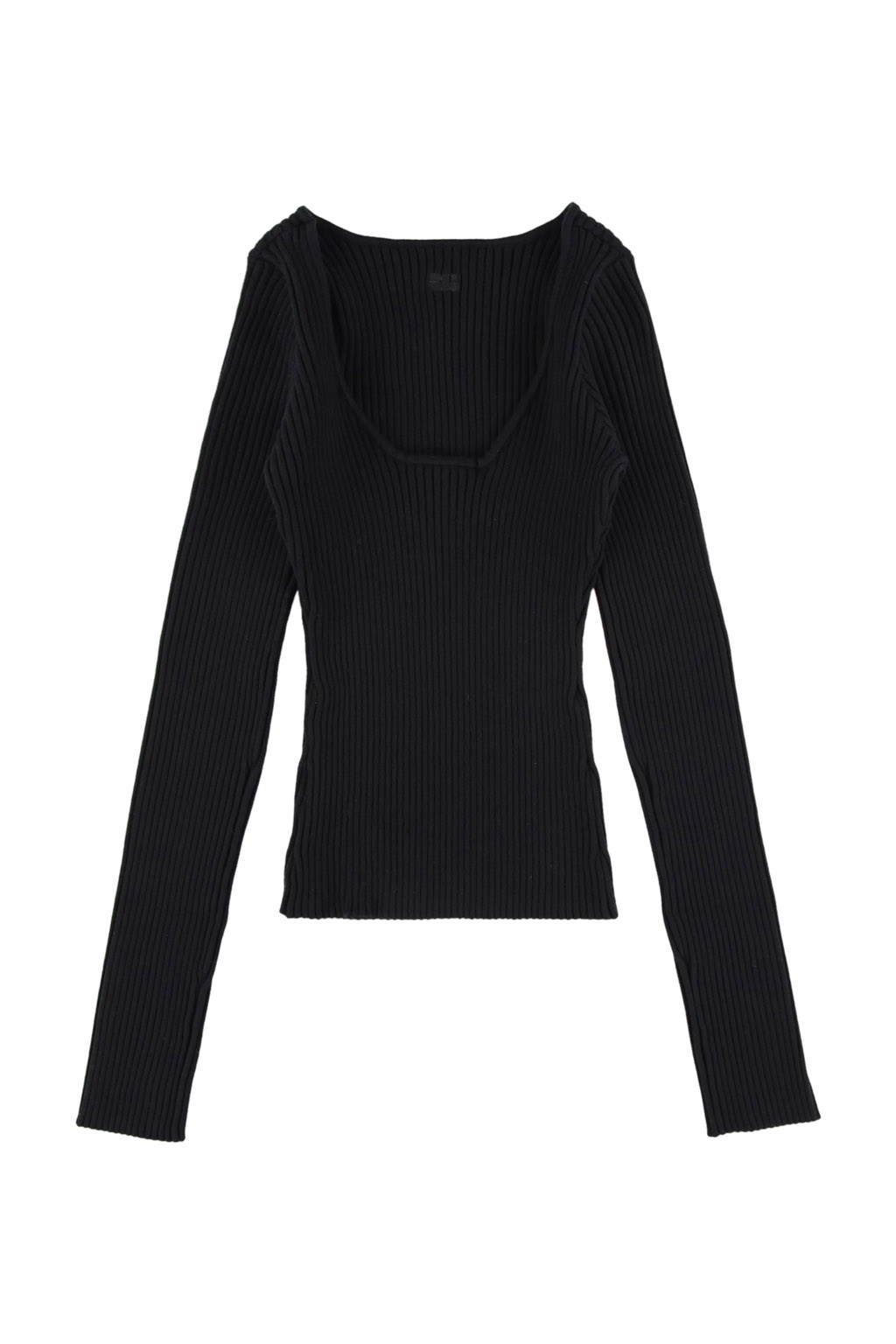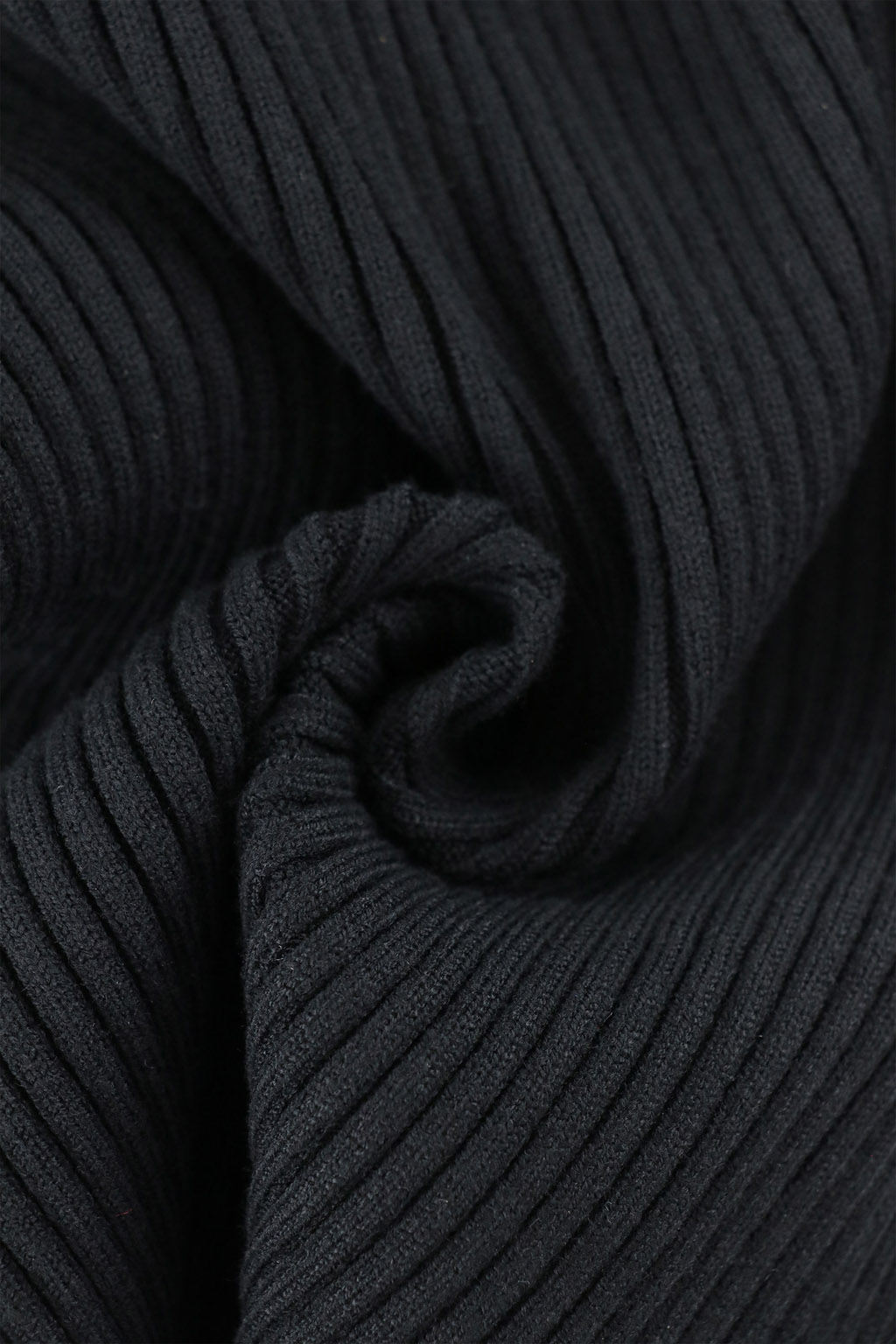 伸縮性のあるリブ編みが女性らしいシルエットを引き立てる、背中開きニットトップス。