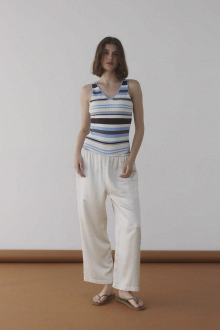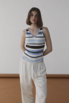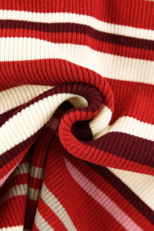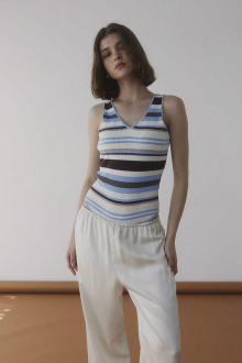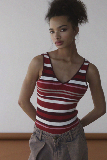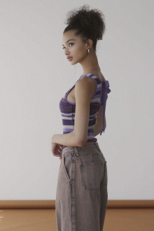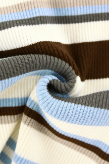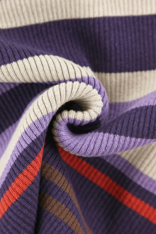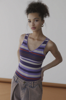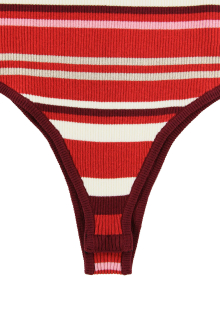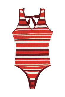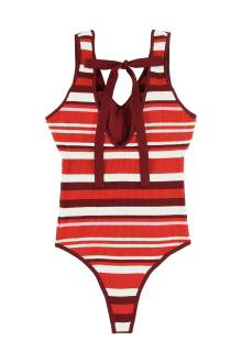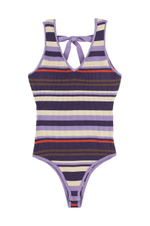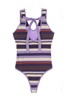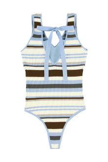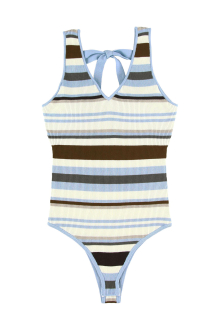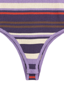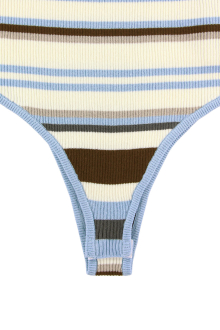 マルチボーダー柄が目を惹く、リブニット素材のボディースーツ。