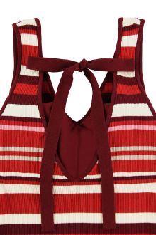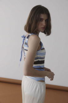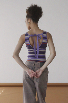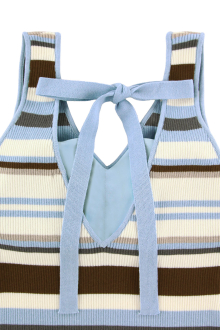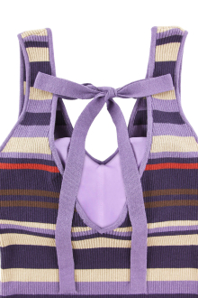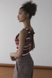 バックスタイルは大きく開いたデザインにリボンをあしらい、ヘルシーさと愛らしさを両立させた1枚に仕上げました。