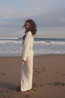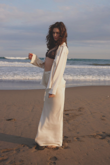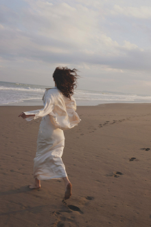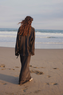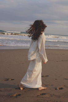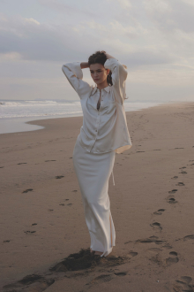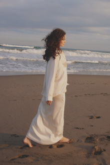 裾に向かって緩やかに広がるシルエットは、動くたびに自然な揺らめきを演出します。