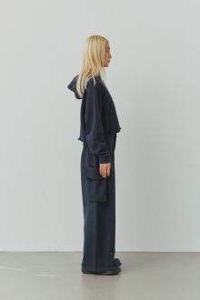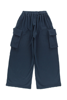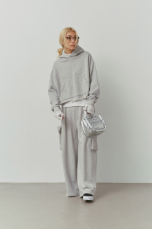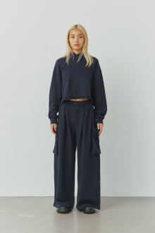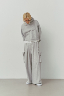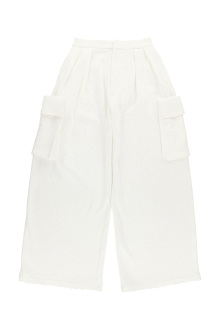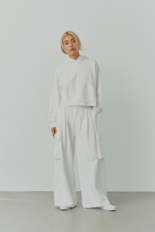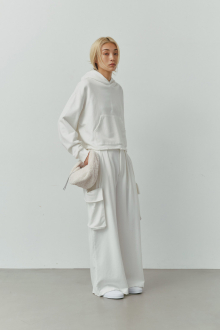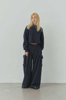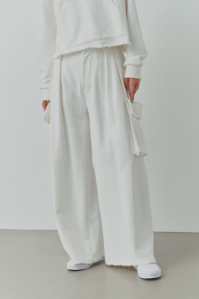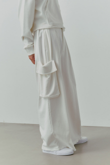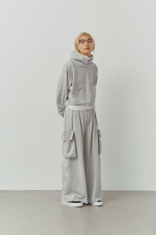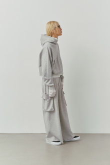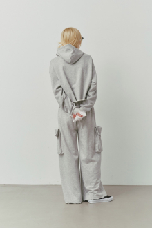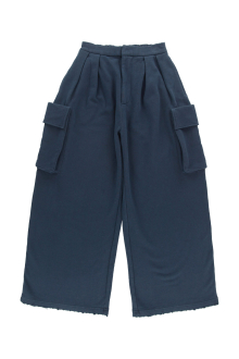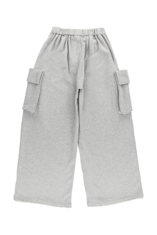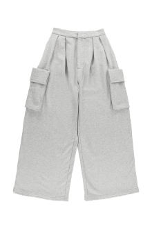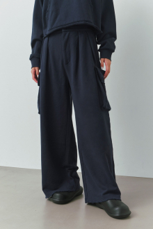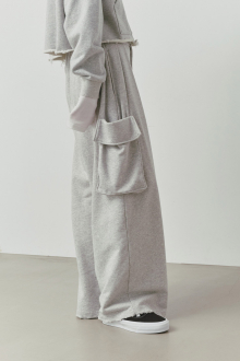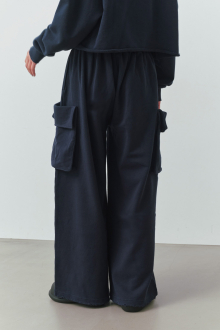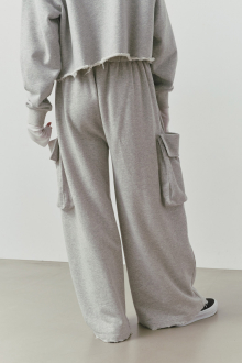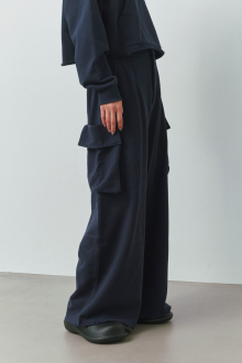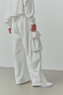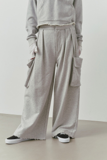 サイドに大きなカーゴポケットが付いた、ワイドスウェットパンツ。