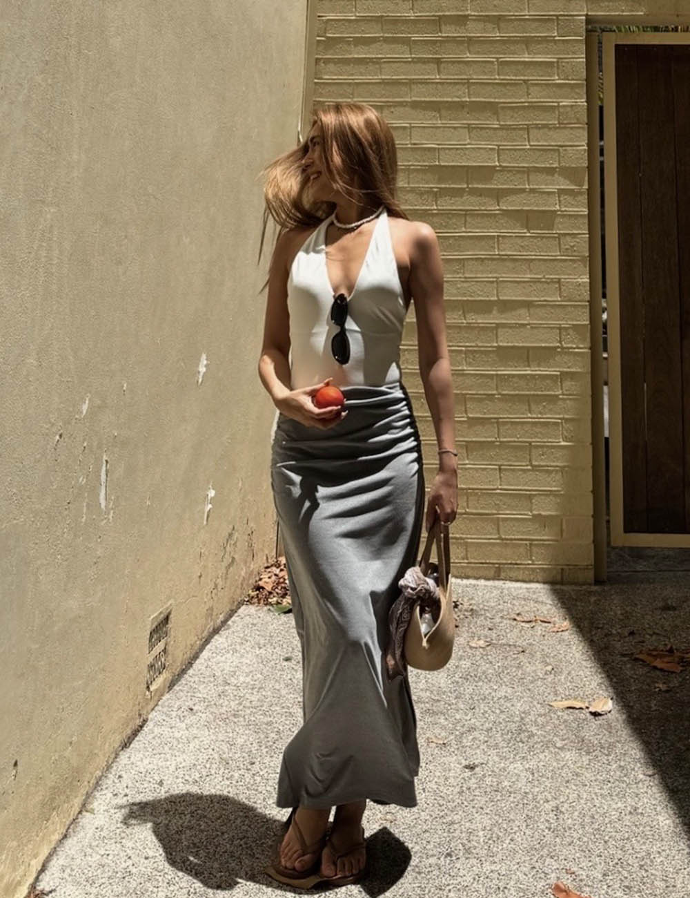 ヒップ周りにはギャザーを施し、ラインを拾いすぎず自然に体に沿うシルエットに。