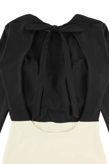 背中が大きく開いたバックスタイルには、長めのリボンが揺れて、360度どこから見ても美しい1枚。