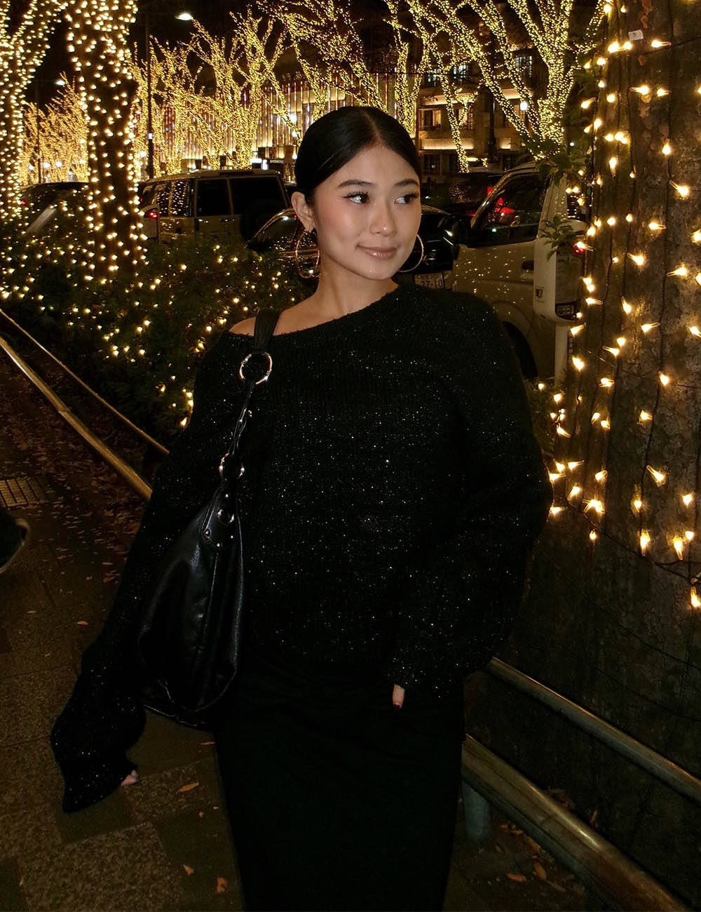 ホリデーシーズンの装いを一段と華やかにしてくれる、特別感のある一枚。