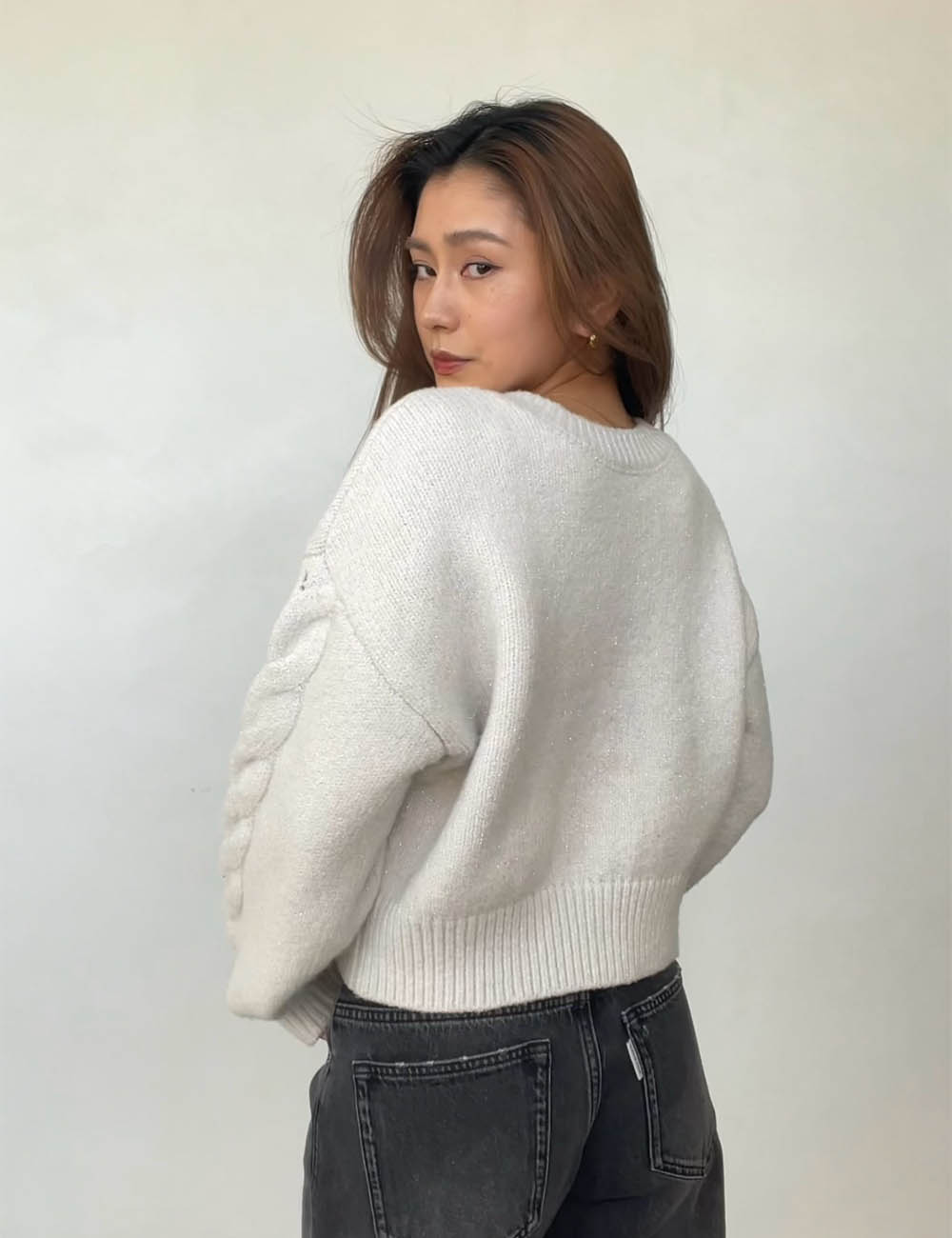 ふんわりとしたケーブル編みのスリーブが、冬の着こなしに可愛らしい表情を添えてくれます。
