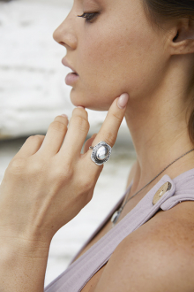 繊細な装飾の縁取りと立体感のあるモチーフが、手元を華やかに魅せるオーバルリング。