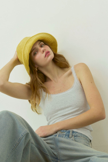 程よい深さとつばの広がりが顔まわりをすっきりと見せつつ、日差し対策としても活躍。