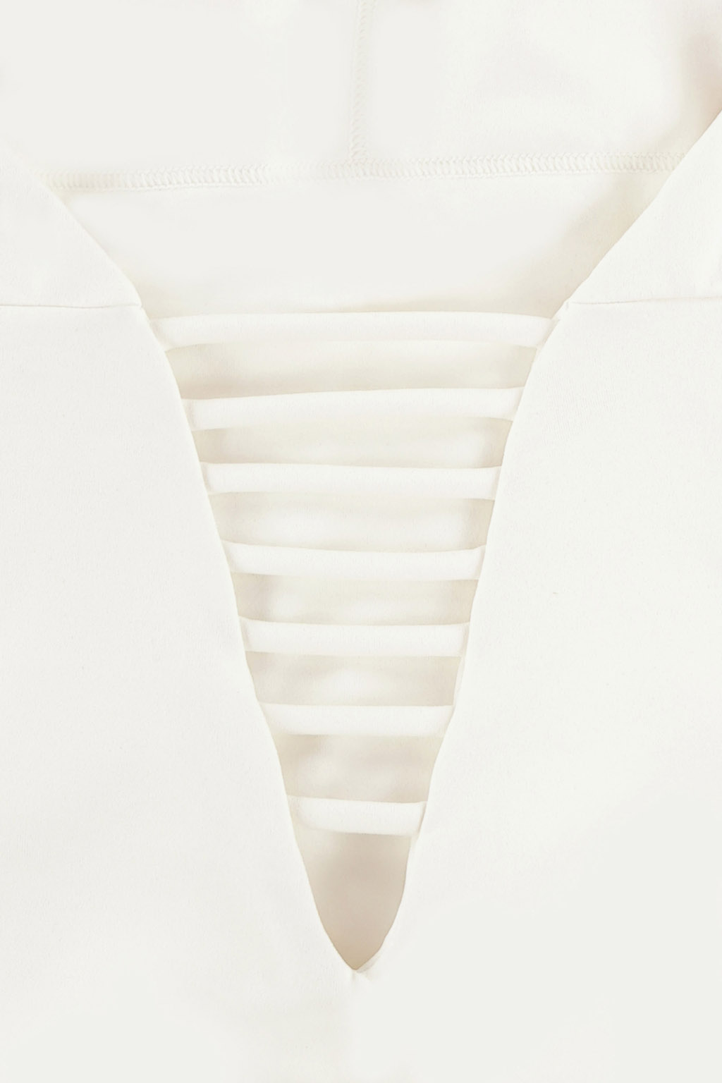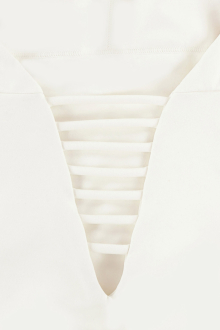 背中のスリット部分に施したストラップは、視覚的に美しいラインを生み出すだけでなく、動いた際のフィット感を高めてくれる実用性も兼ね備えています。