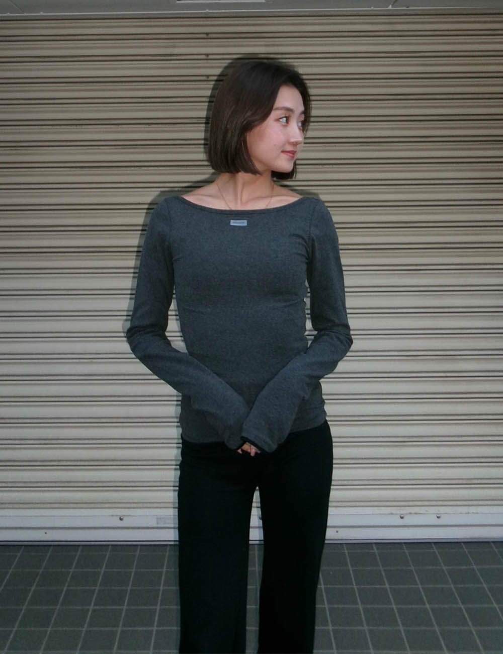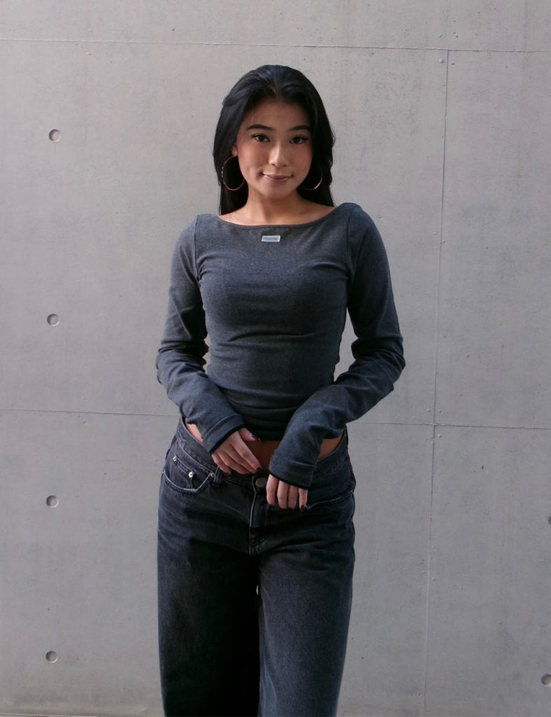 フロントはボートネックデザインでデコルテをきれいに見せ、自然体の抜け感を演出します。