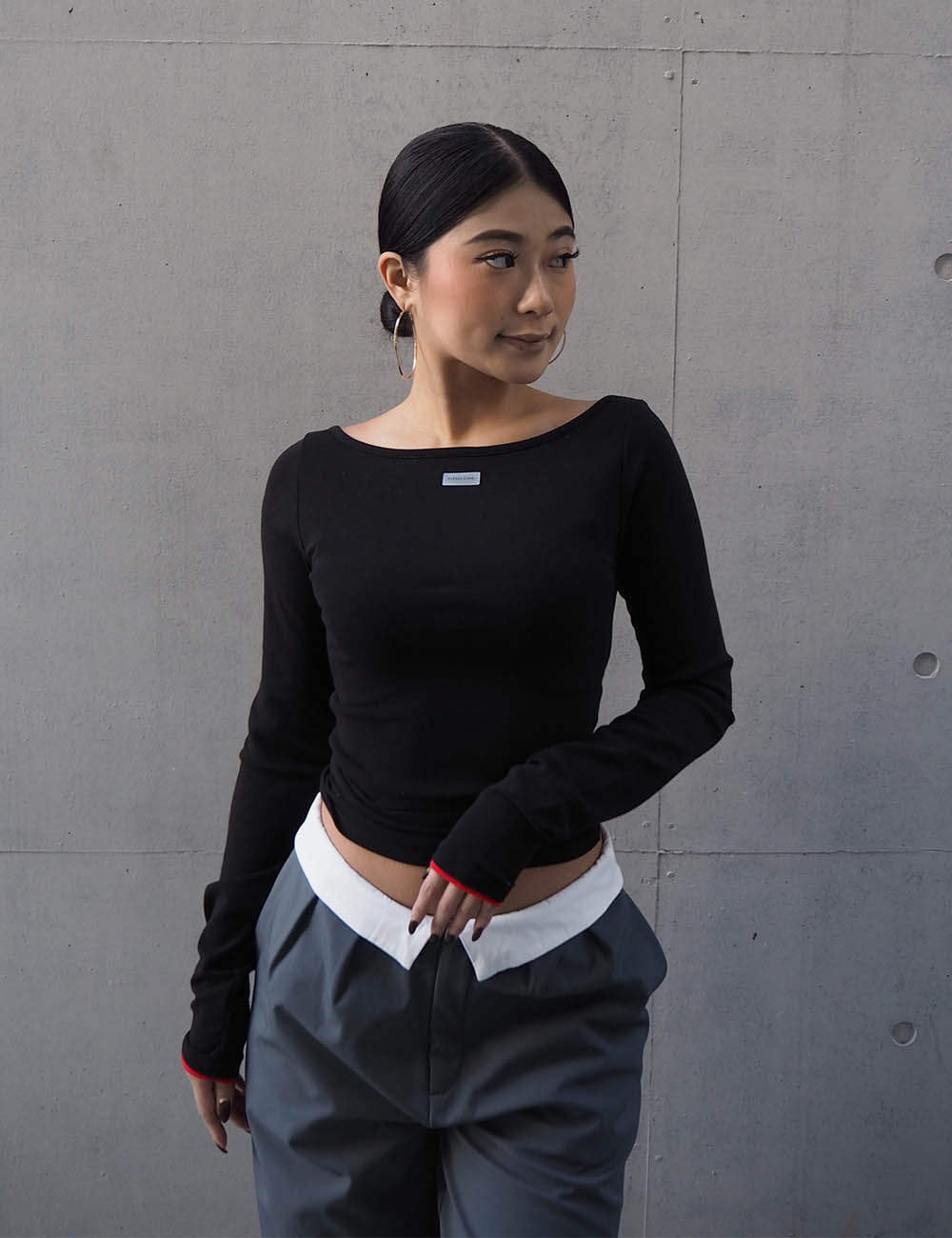 袖口の配色がポイントのバックオープンロングスリーブTシャツ。