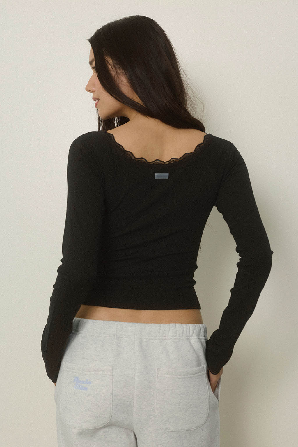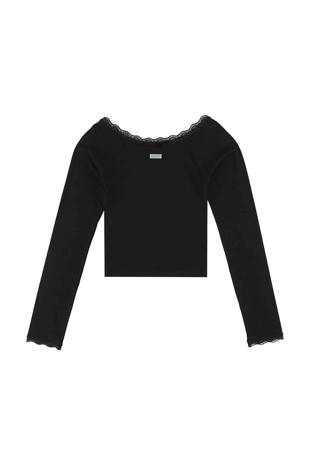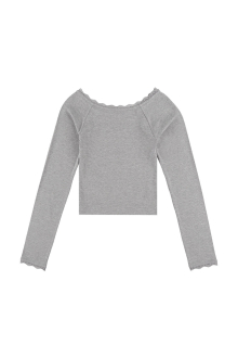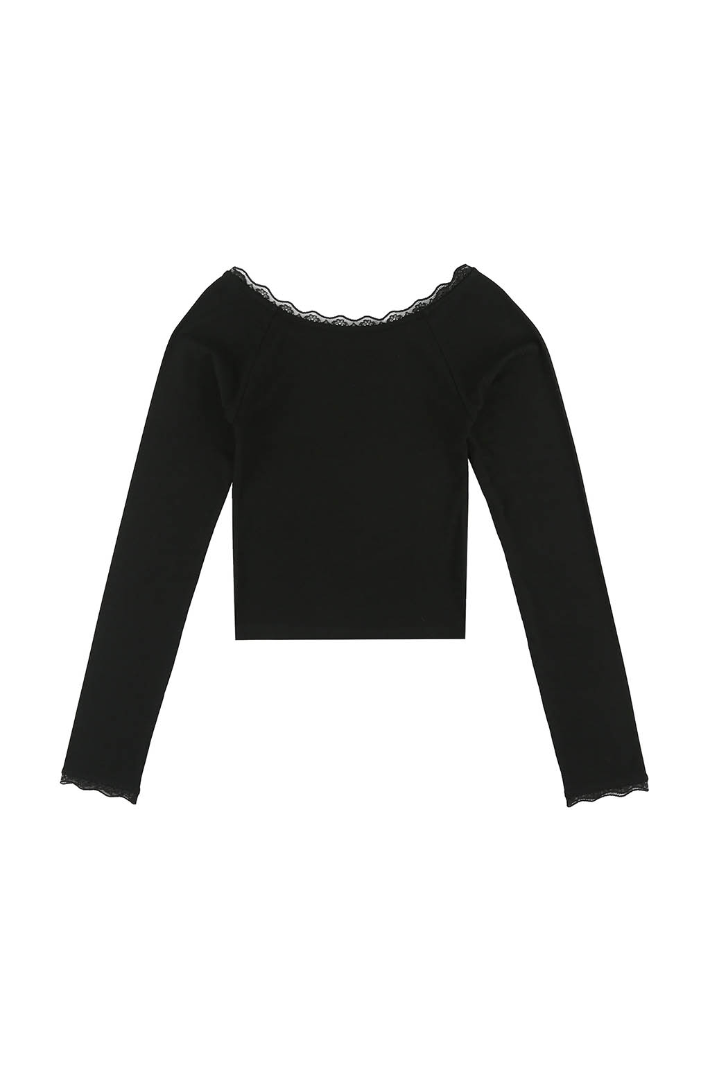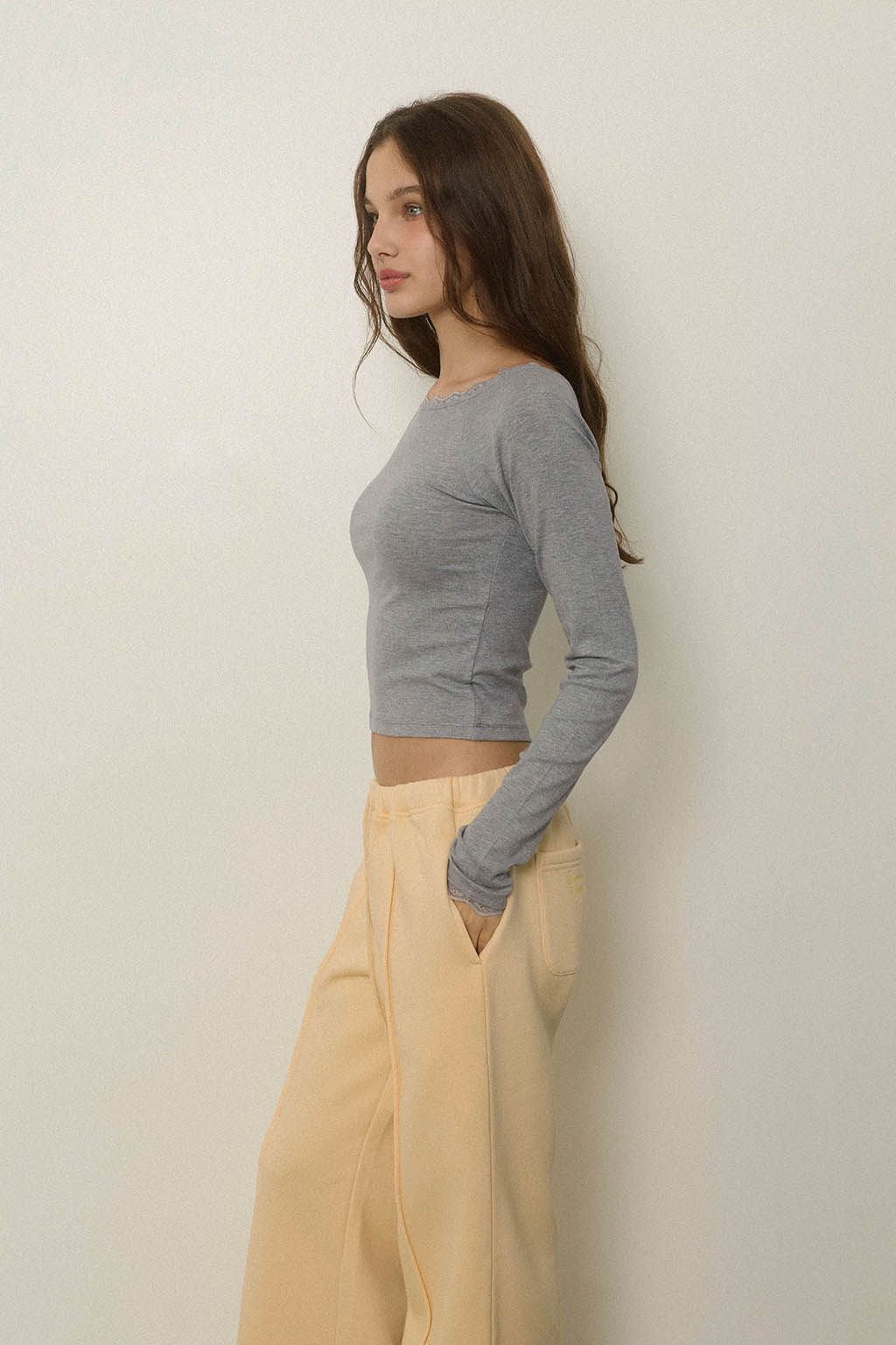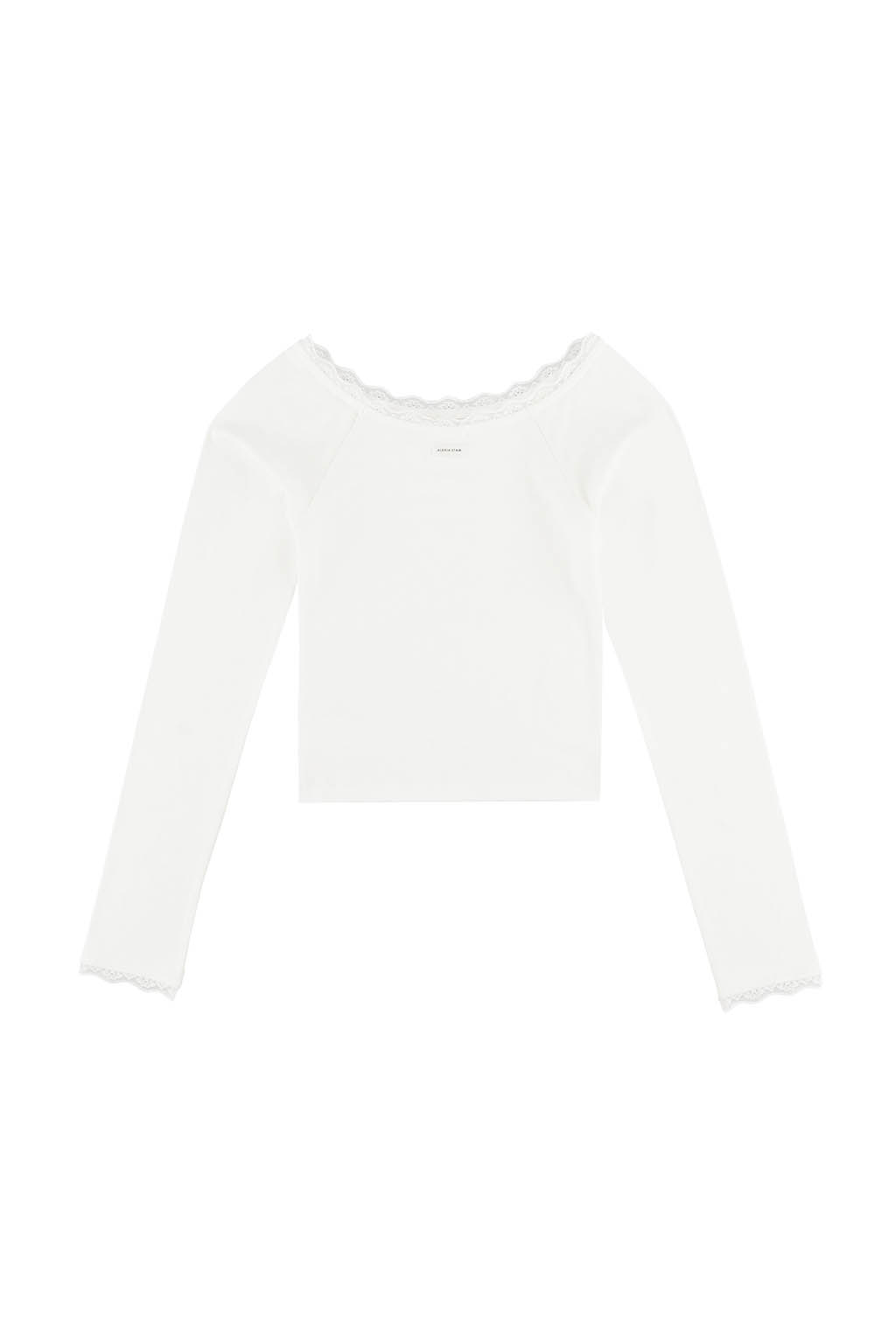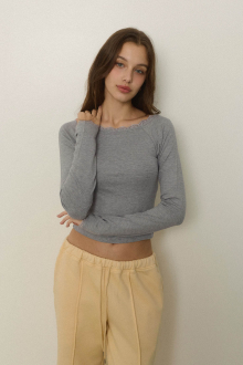 繊細なレースをあしらったネックラインが女性らしさを引き立てる、リブロングTシャツ。