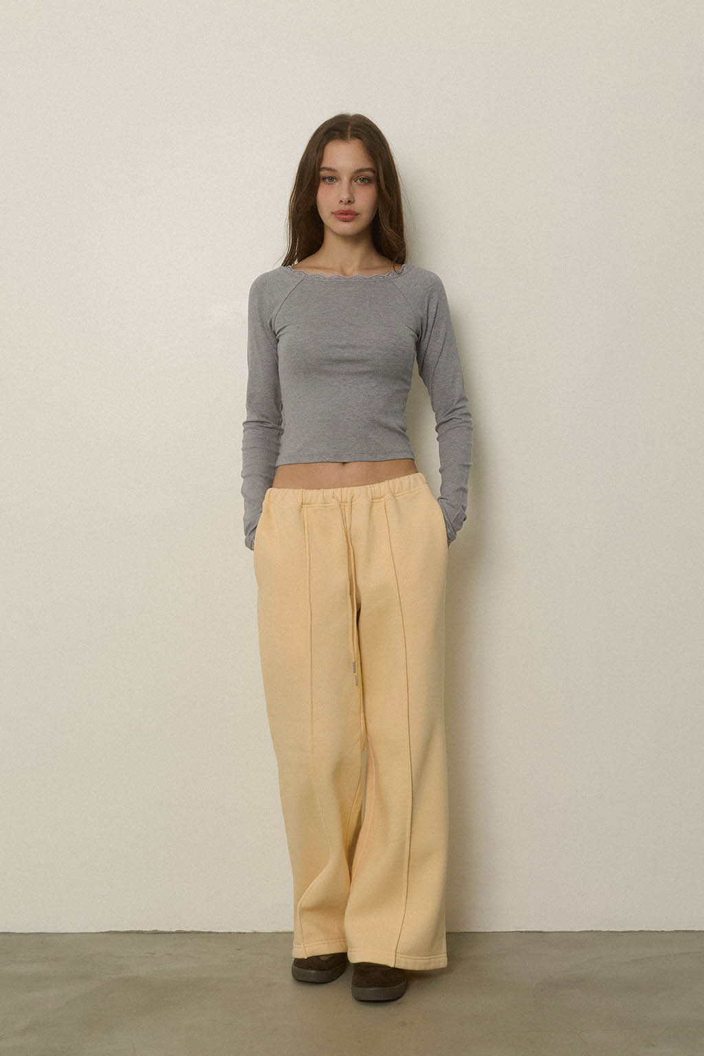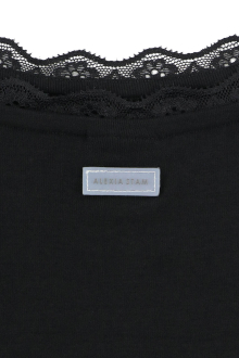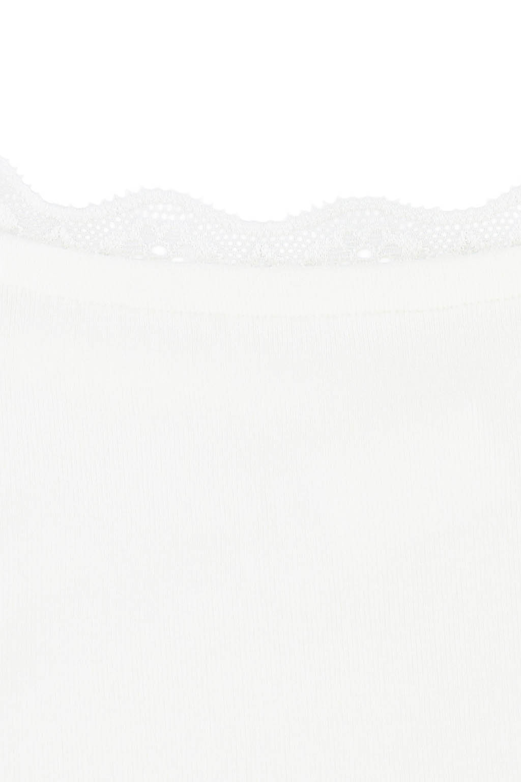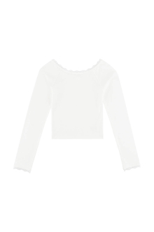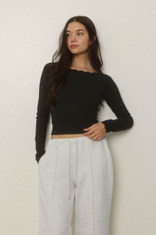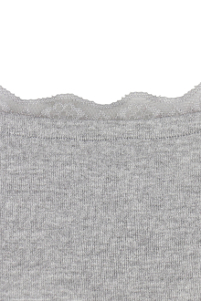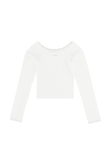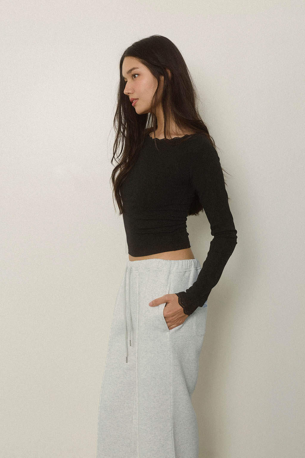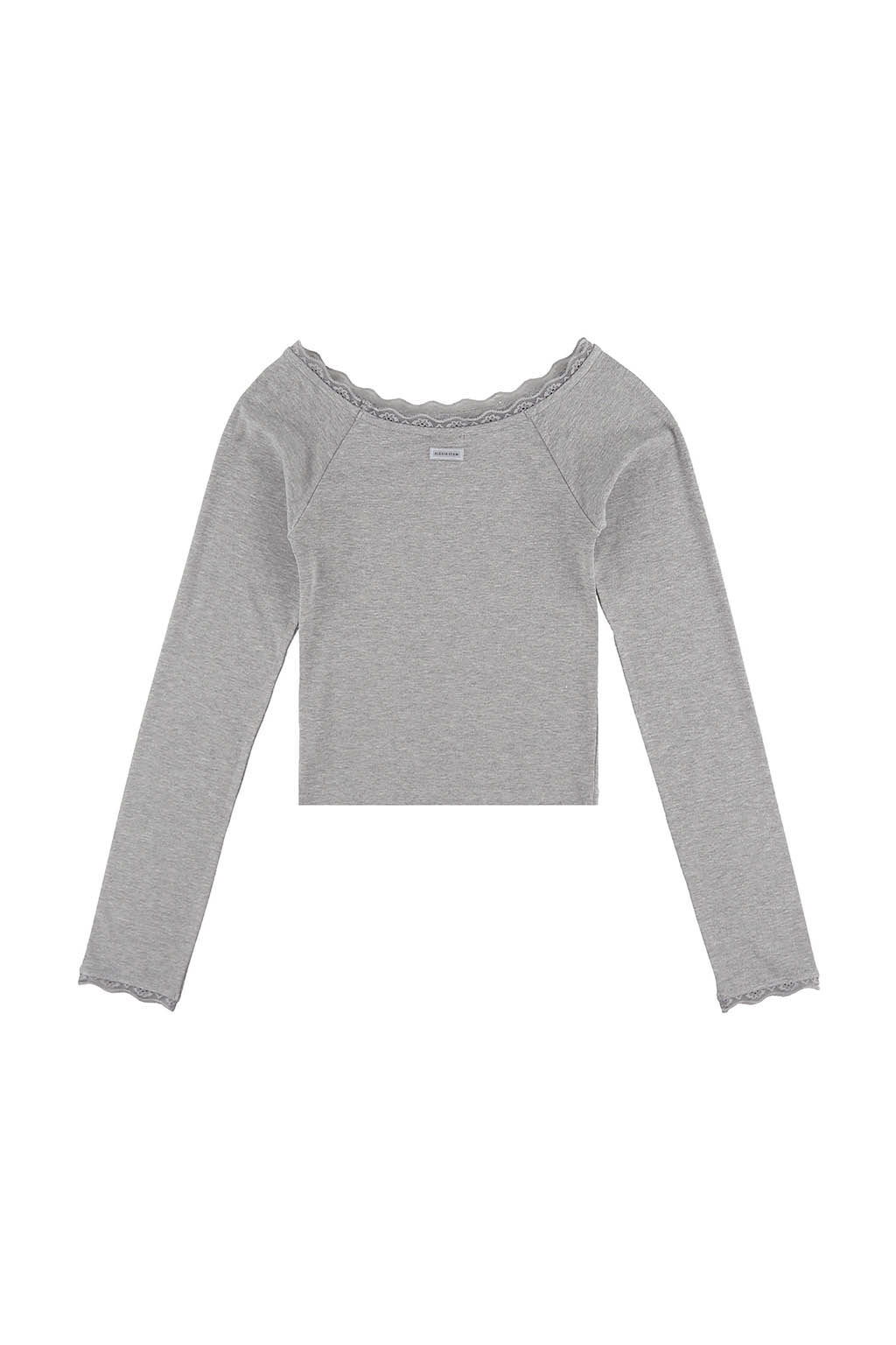 繊細なレースをあしらったネックラインが女性らしさを引き立てる、リブロングTシャツ。