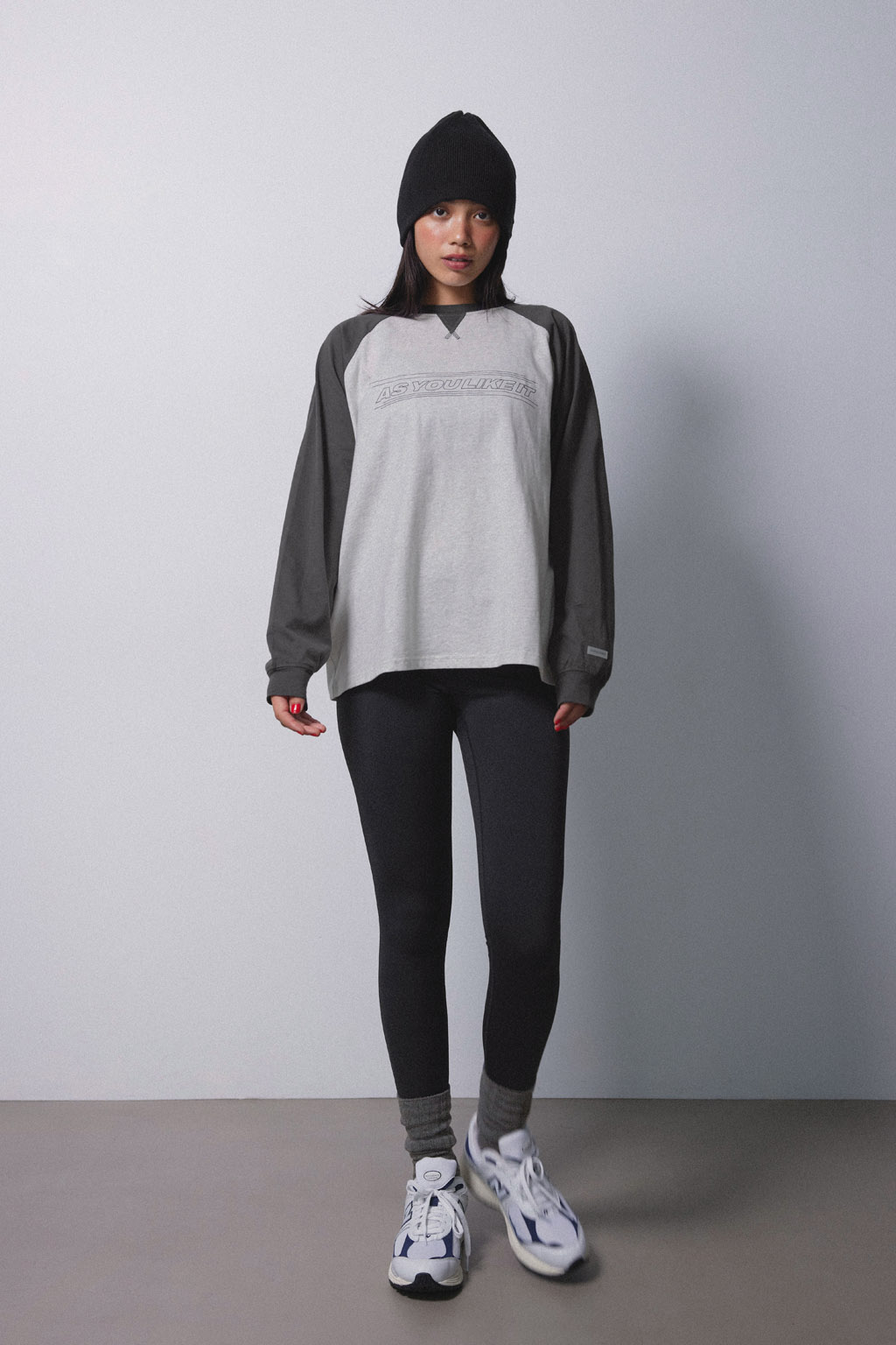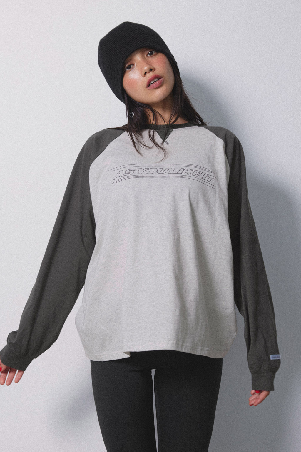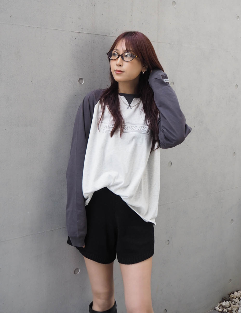 胸元のメッセージロゴが遊び心を添え、ラフな中にも都会的なムードを演出。