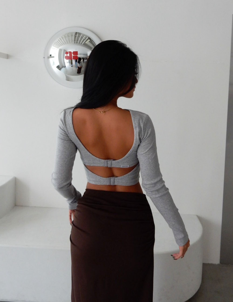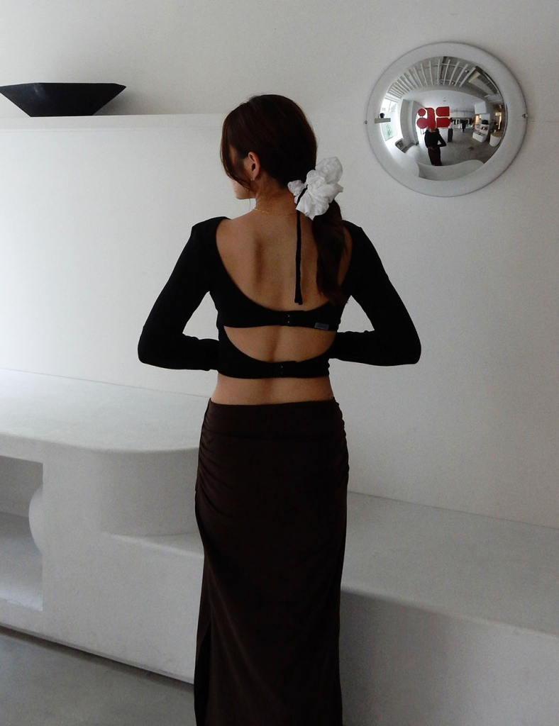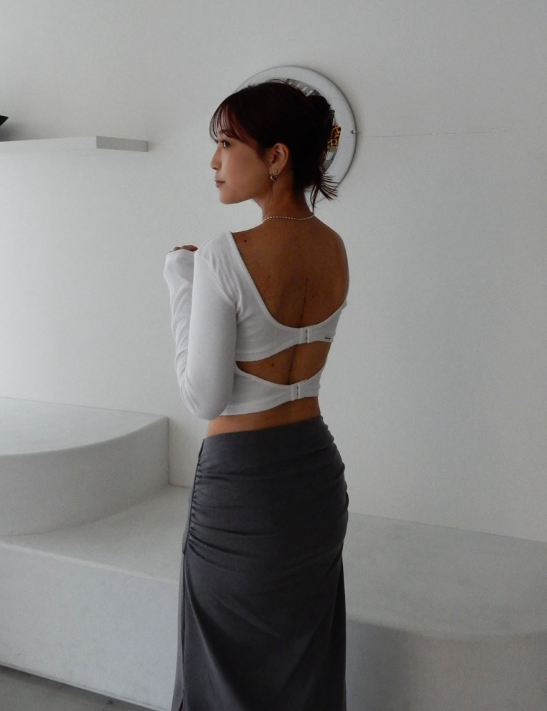 バックシャンな背面アジャスターが施されたロングスリーブトップス。