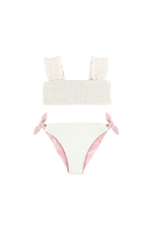 肩のフリルが可愛く、ボトムスのリバーシブル仕様が大人顔負けのデザインで、おしゃれが好きなビーチガールをもっとキュートに見せるスペシャルビキニです。